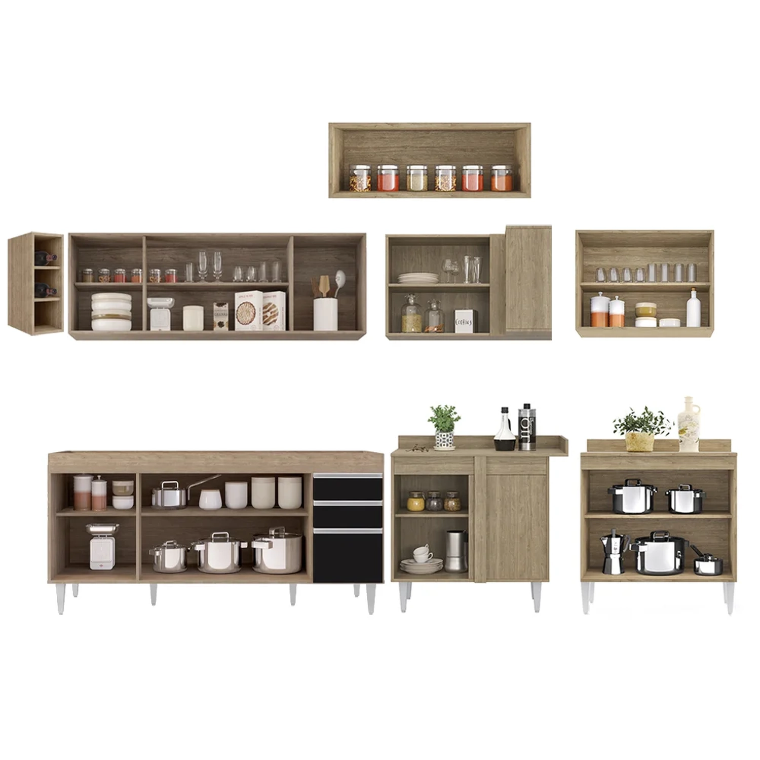 Conteúdo da Embalagem: 1 Balcão 180cm, 1 Armário Aéreo 160cm, 1 Armário Aéreo 70cm, 1 Armário Aéreo 80cm, 1 Balcão 80cm, 1 Balcão de canto, 1 Armário Aéreo de Canto, 1 Nicho.