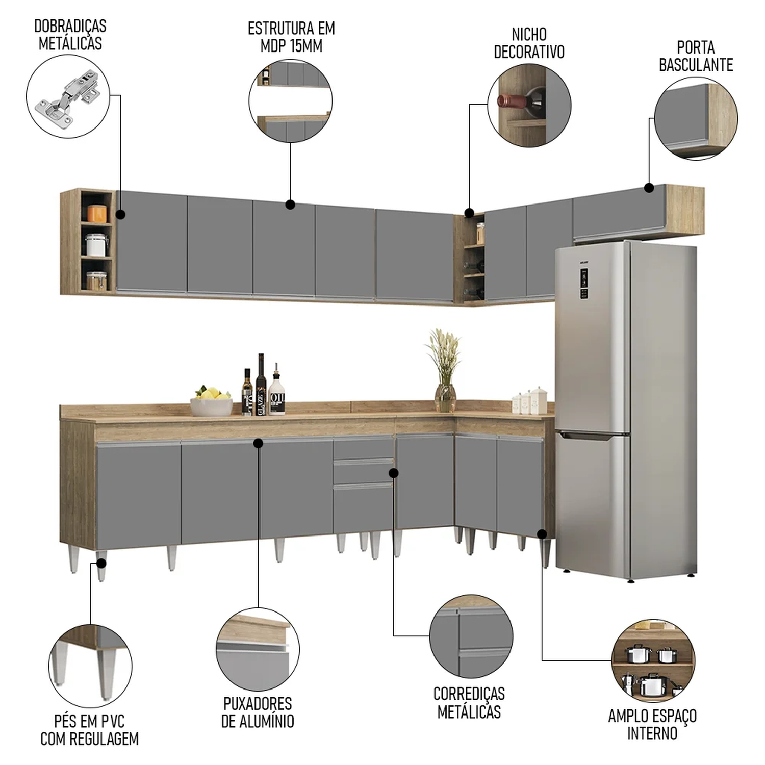 Além de ser composto por peças essenciais, como balcão 180cm com tampo, armários aéreos, balcão de canto, nicho garrafeiro e balcão 2 portas, esse jogo de cozinha completo ainda conta com uma maior resistência contra riscos e umidade, garantindo sua durabilidade por muito tempo, graças ao acabamento em BP. Já os pés ajustáveis permitem você nivelar o móvel em qualquer tipo de piso. Para completar, o design contemporâneo dessa cozinha de canto se adapta facilmente a qualquer estilo de decoração, ao passo que a configuração de canto otimiza a circulação no ambiente.