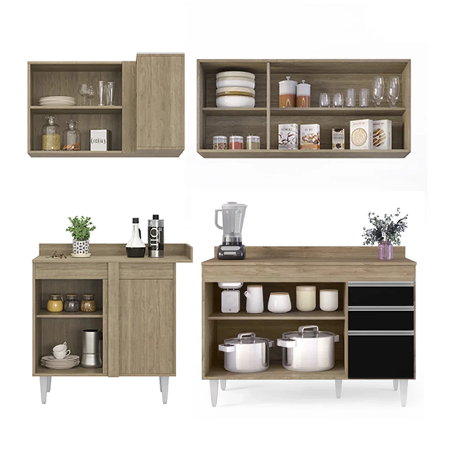 Conteúdo da Embalagem: 1 Balcão 120cm, 1 Armário Aéreo 120cm, 1 Balcão de Canto, 1 Armário Aéreo de Canto, 1 Tampo 120cm.