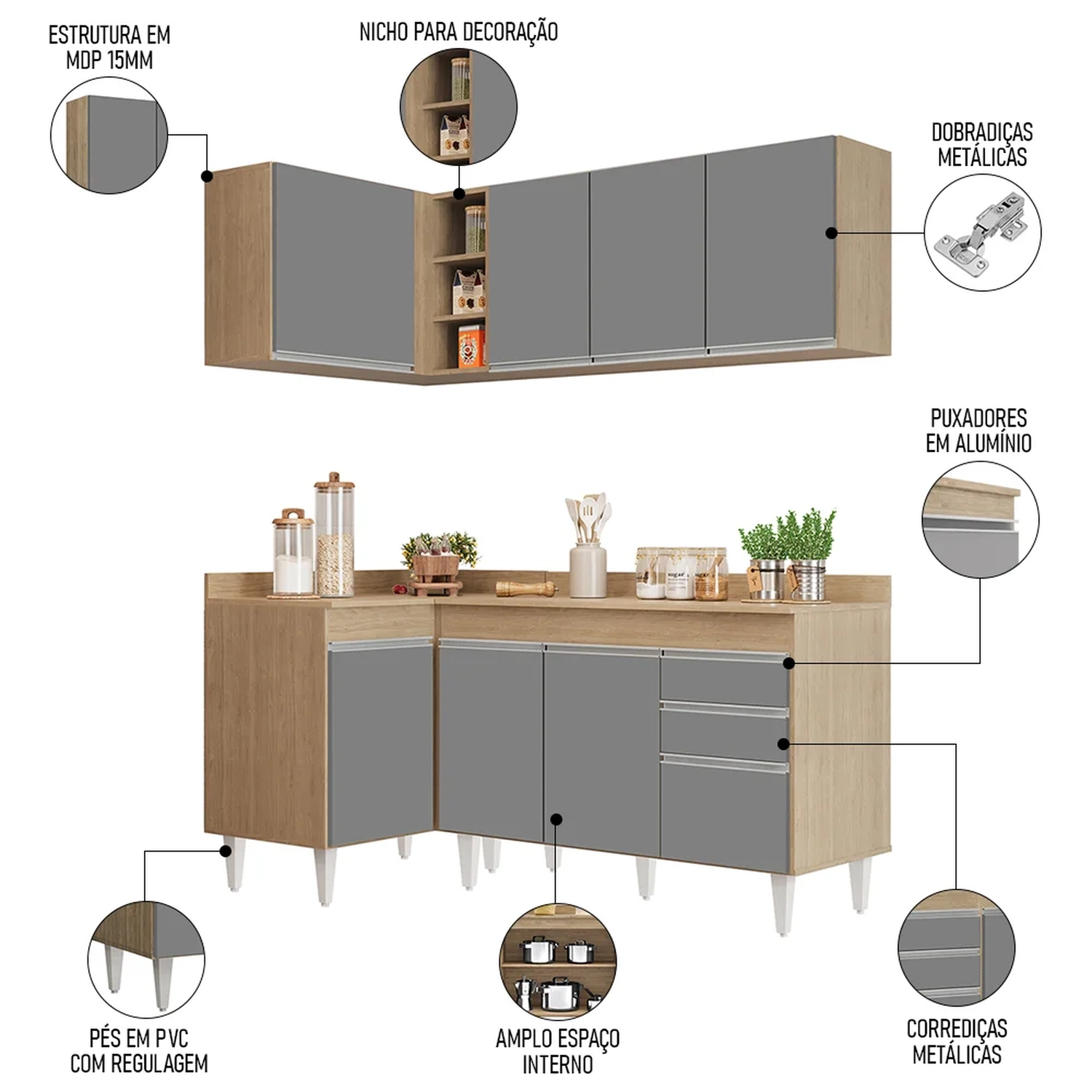 Além disso, o acabamento BP confere a esse jogo de cozinha completo uma maior resistência contra riscos e umidade, garantindo sua durabilidade por muito tempo. Já os pés ajustáveis permitem que você nivelar o móvel em qualquer tipo de piso. Para completar, o design contemporâneo dessa cozinha de canto se adapta facilmente a qualquer estilo de decoração, ao passo que a configuração de canto otimiza a circulação no ambiente.