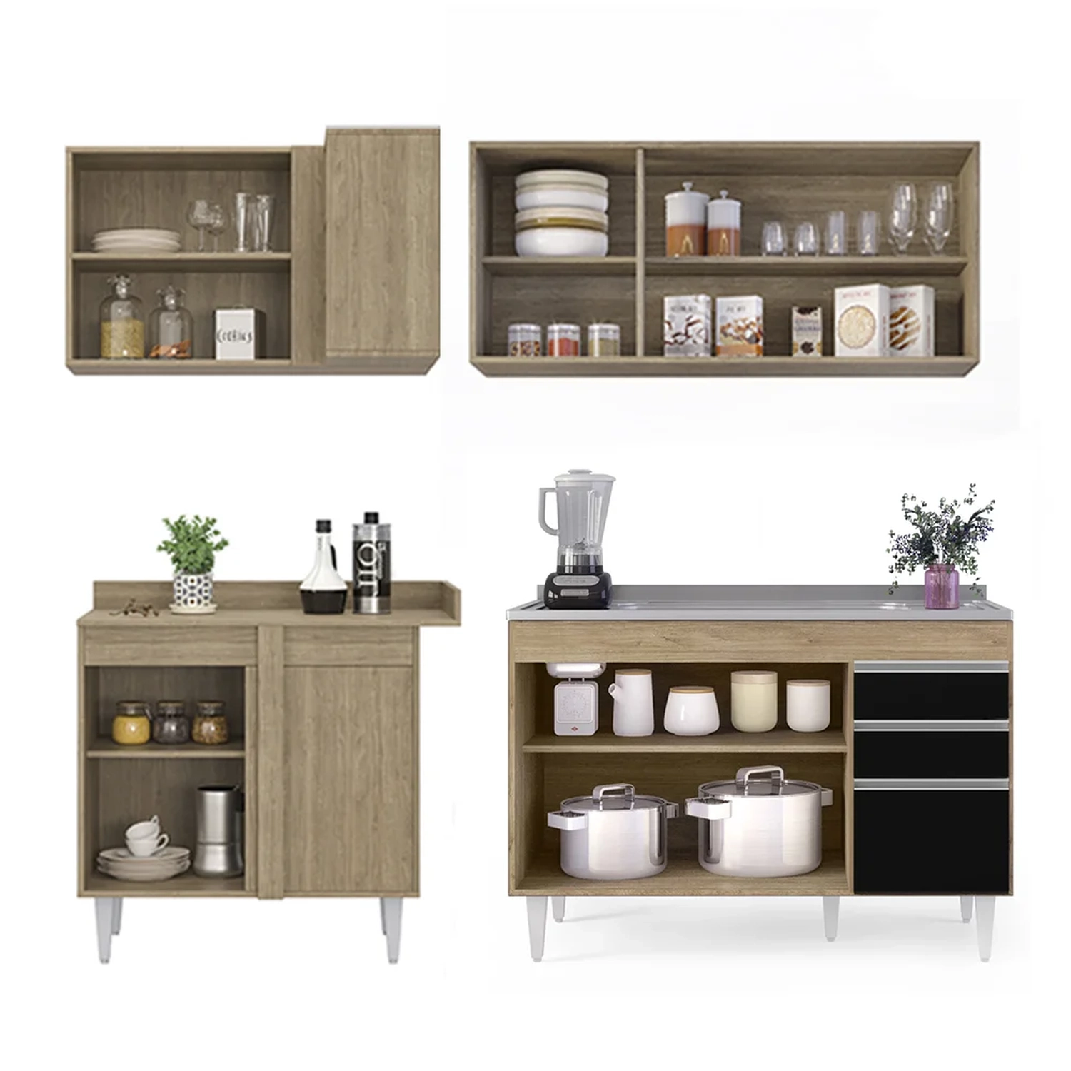Conteúdo da Embalagem: 1 Balcão 120cm, 1 Armário Aéreo 120cm, 1 Balcão de Canto, 1 Armário Aéreo de Canto, 1 Pia Inox 120cm.