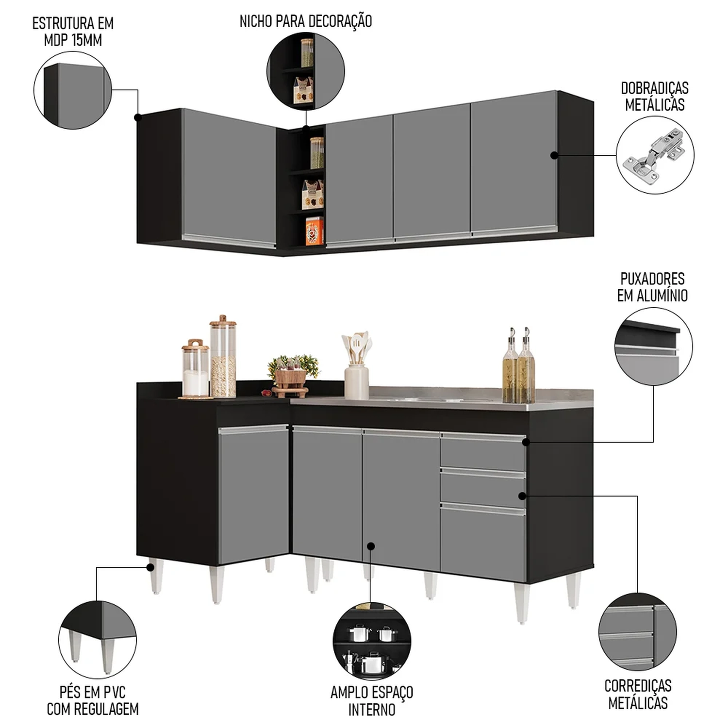 Conteúdo da Embalagem: 1 Balcão 120cm, 1 Armário Aéreo 120cm, 1 Balcão de Canto, 1 Armário Aéreo de Canto, 1 Pia Inox 120cm.