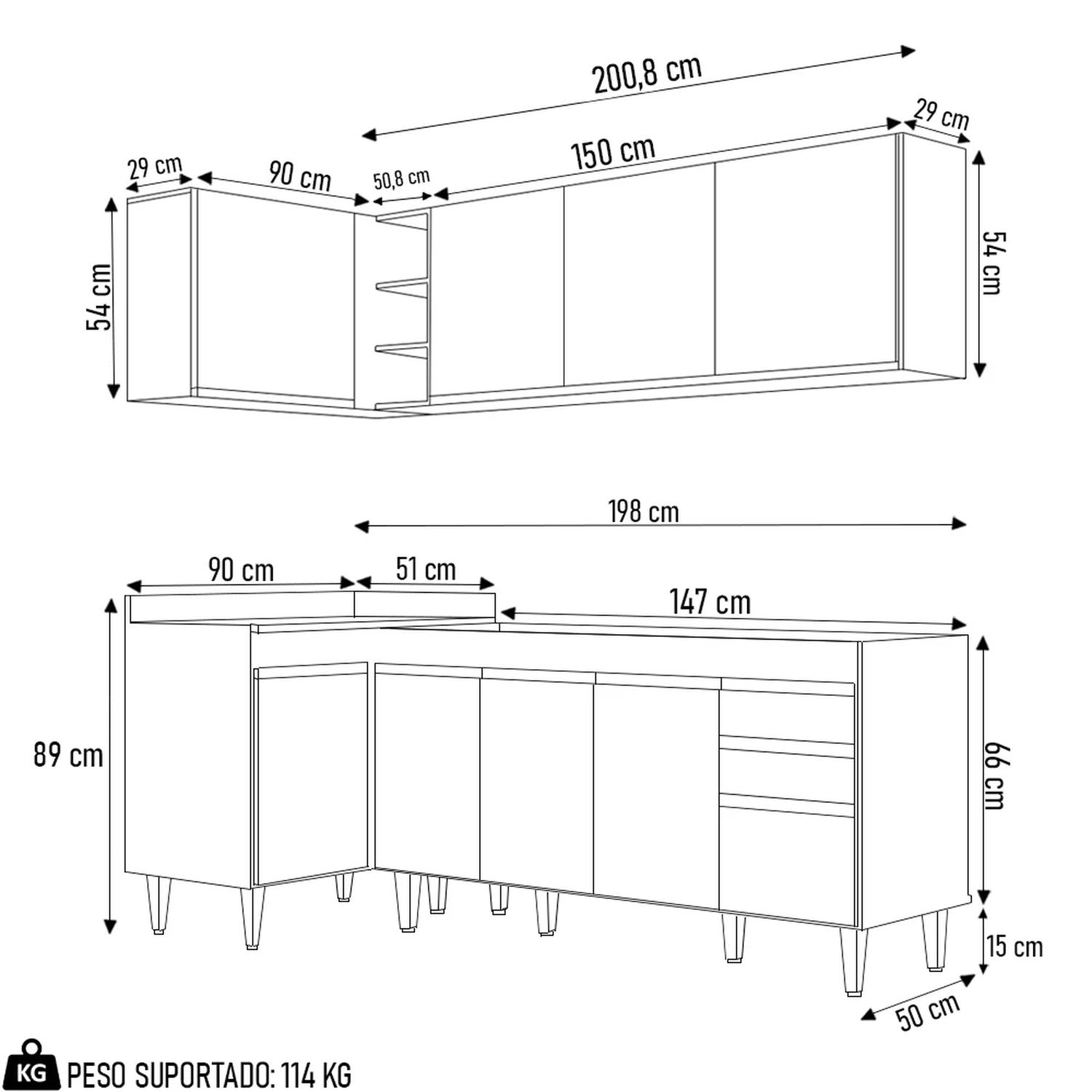 Conteúdo da Embalagem: 1 Balcão 150cm, 1 Armário Aéreo 150cm, 1 Balcão de canto, 1 Armário Aéreo de Canto.