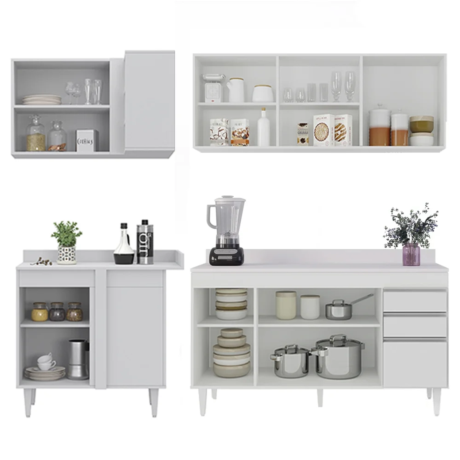 Conteúdo da Embalagem: 1 Balcão 150cm, 1 Armário Aéreo 150cm, 1 Balcão de canto, 1 Armário Aéreo de Canto, 1 Tampo 150cm.