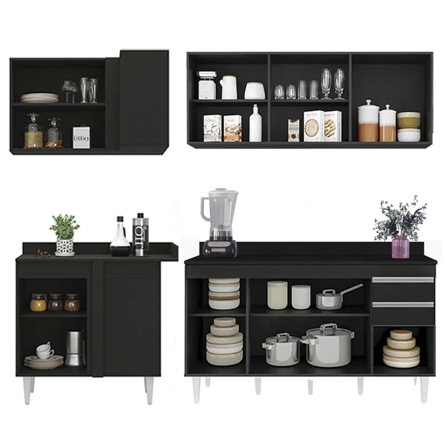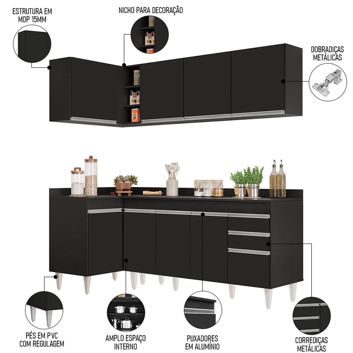 Procura uma cozinha prática e funcional?! Então, acaba de encontrar. Com o Armário de Cozinha Modulado de Canto Direito 4 Peças CP41 Balcão com Tampo Preto, da Lumil, você terá tudo o que precisa ao seu alcance. Composto por 4 peças inteligentemente projetadas, esse armário modulado oferece uma distribuição interna perfeita para organizar todos os seus utensílios.