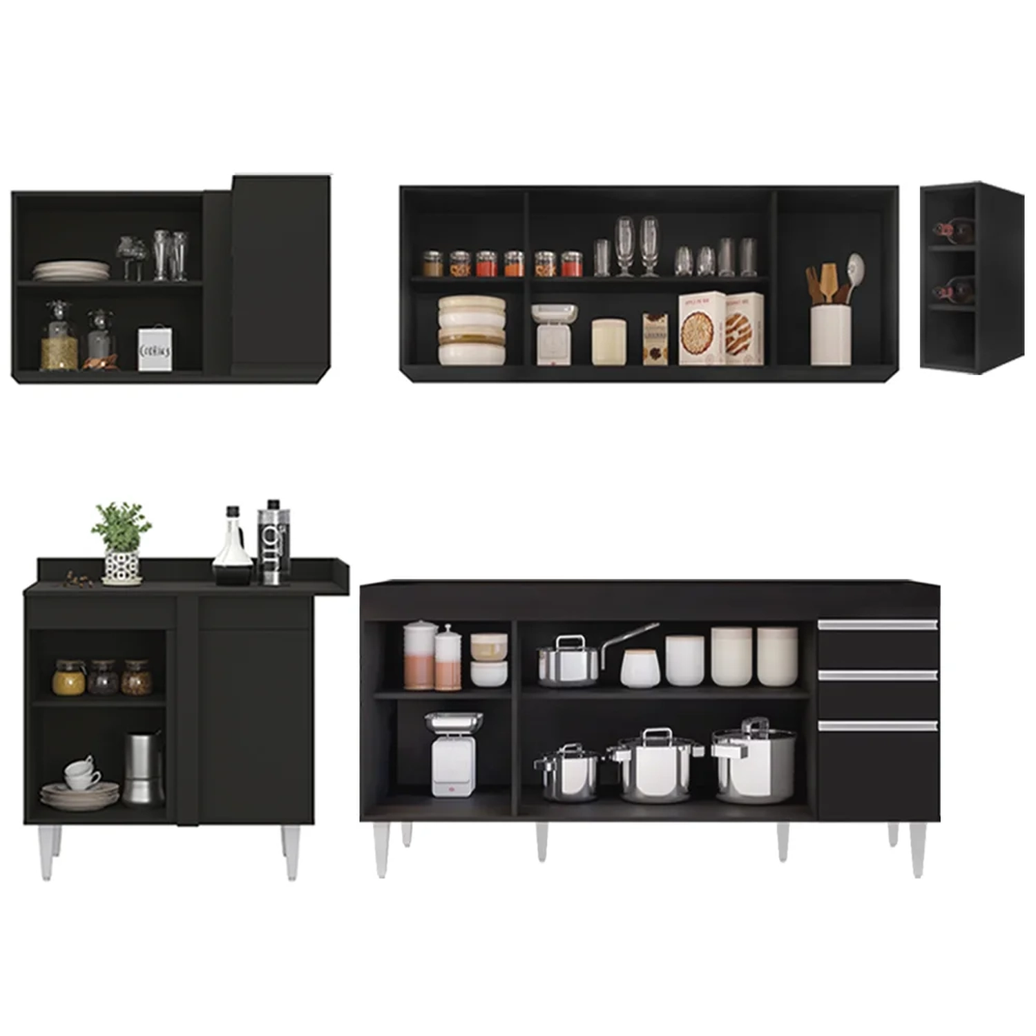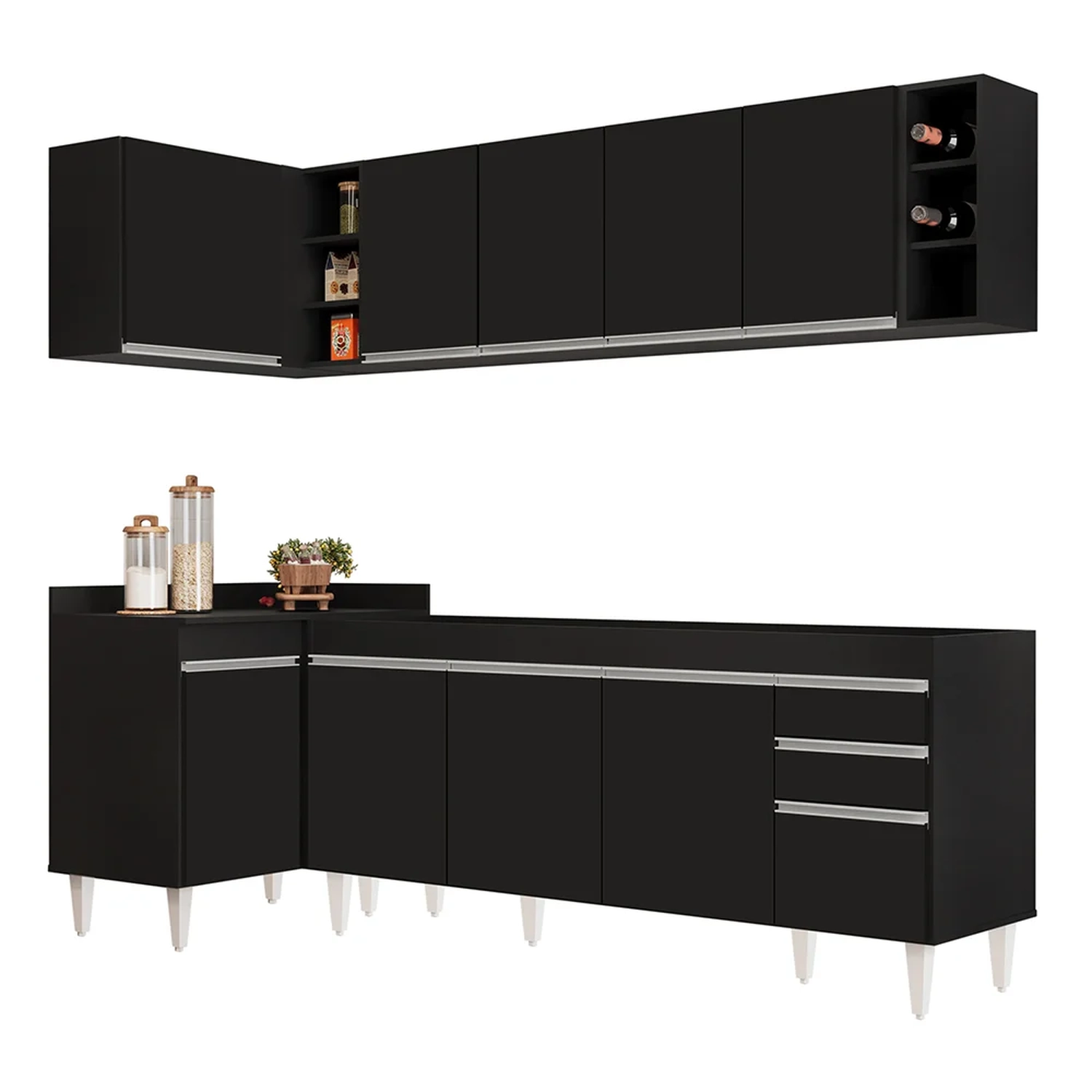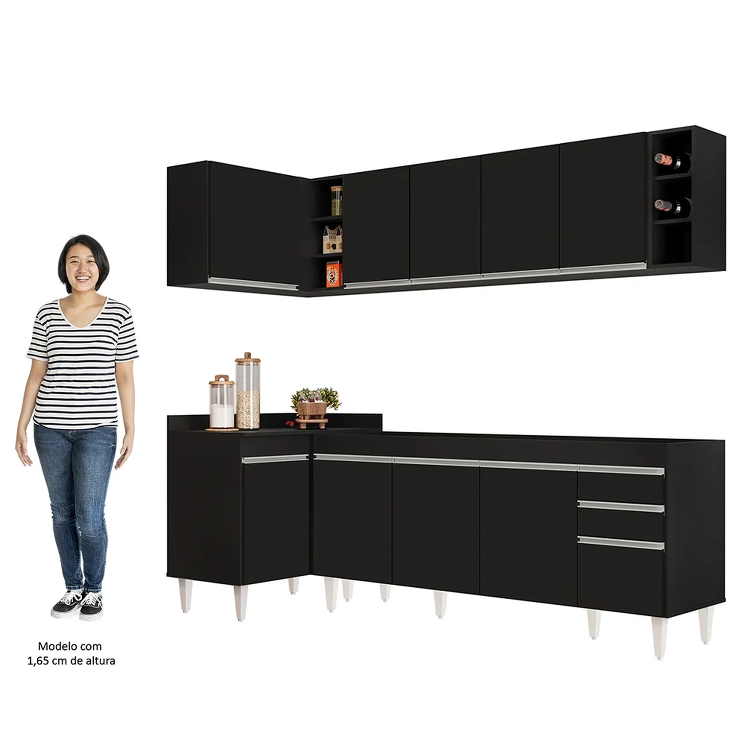 Renove a sua cozinha com o Armário de Cozinha Modulado de Canto Direito 5 Peças CP43 Balcão sem Tampo Preto, da Lumil, você terá tudo o que precisa ao seu alcance. Composto por 5 peças, sendo balcão para pia 180cm, armários aéreos, balcão de canto e nicho garrafeiro , esse armário modulado oferece uma distribuição interna perfeita para organizar todos os seus utensílios.