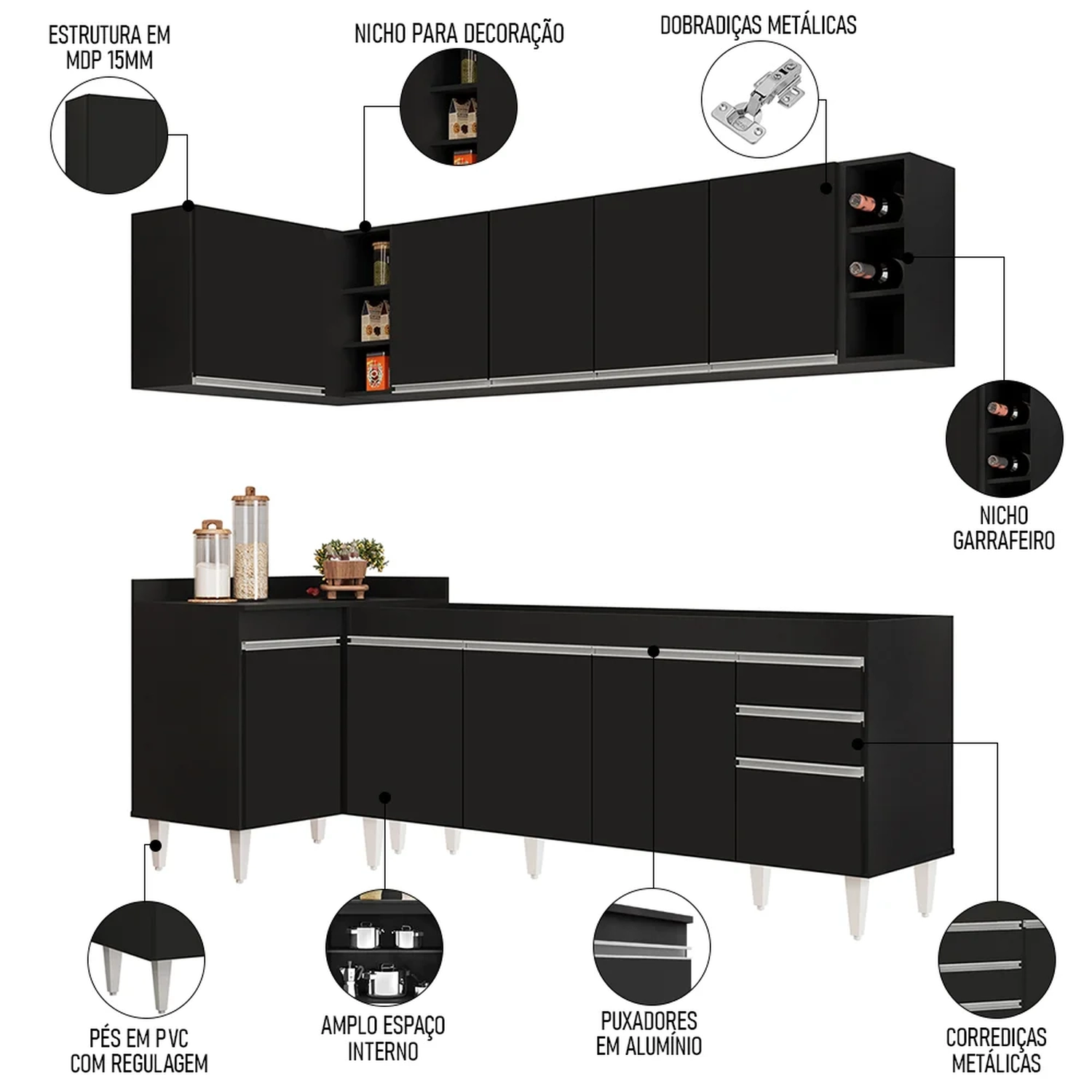 Conteúdo da Embalagem: 1 Balcão 180cm, 1 Armário Aéreo 160cm, 1 Balcão de canto, 1 Armário Aéreo de Canto, 1 Nicho.