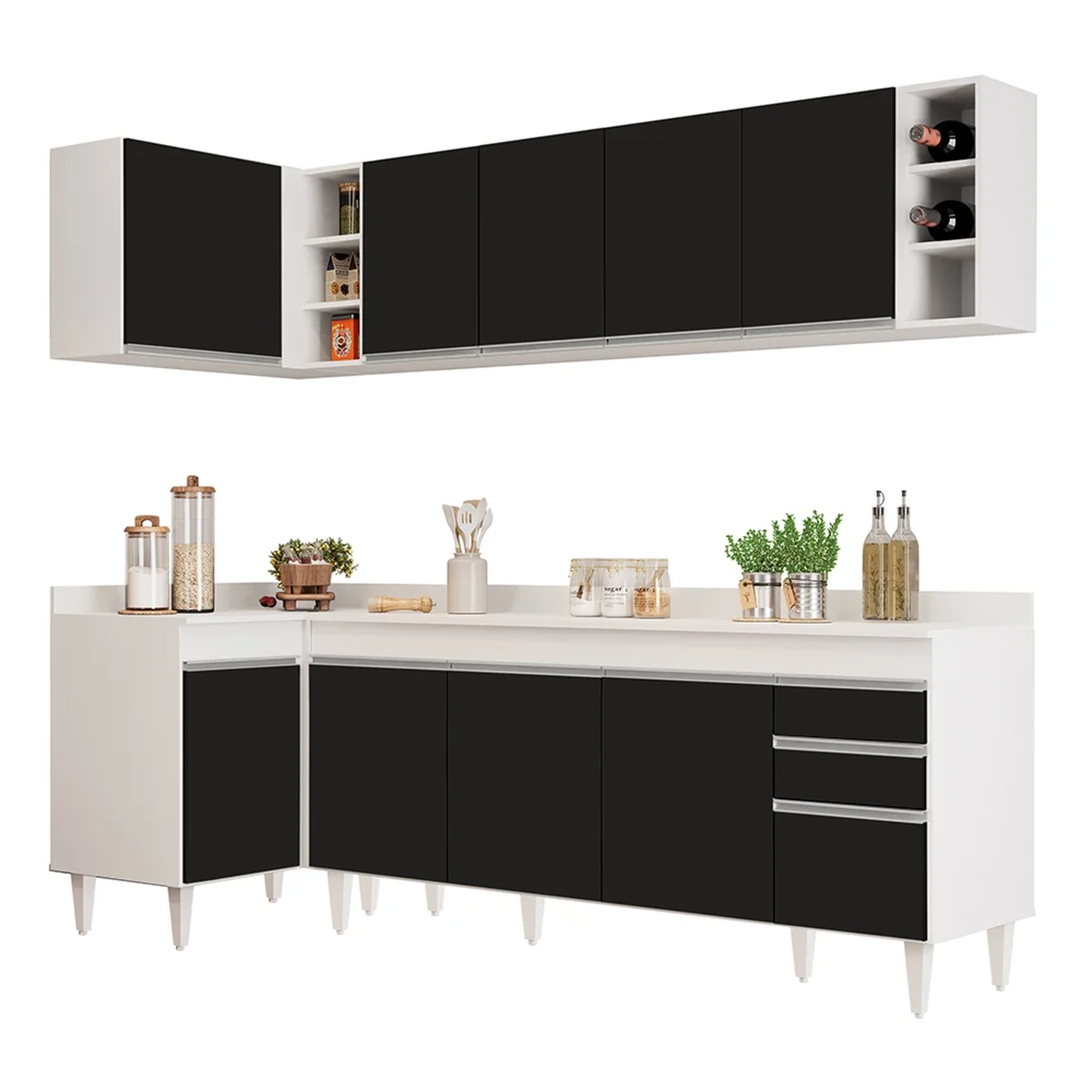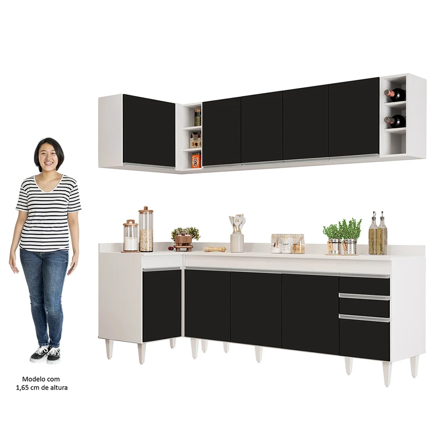 Renove a sua cozinha com o Armário de Cozinha Modulado de Canto Direito 5 Peças CP44 Balcão com Tampo Branco/Preto, da Lumil, você terá tudo o que precisa ao seu alcance. Composto por 5 peças, sendo balcão gabinete com tampo, armários aéreos, balcão de canto e nicho garrafeiro, esse armário modulado oferece uma distribuição interna perfeita para organizar todos os seus utensílios.