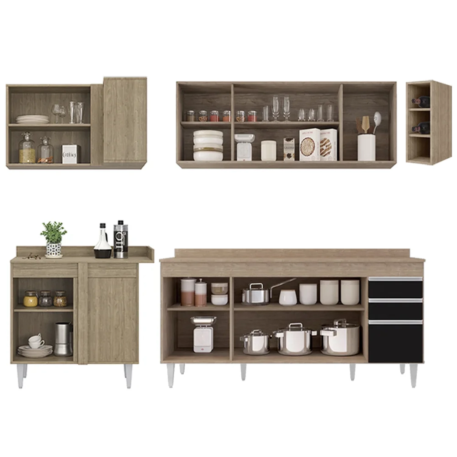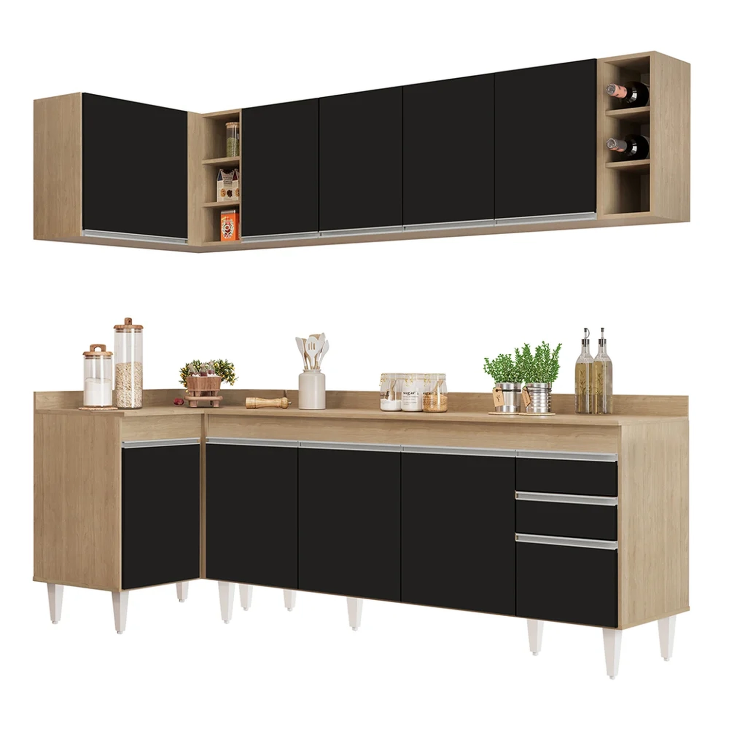 Conteúdo da Embalagem: 1 Balcão 180cm, 1 Armário Aéreo 160cm, 1 Balcão de canto, 1 Armário Aéreo de Canto, 1 Nicho, 1 Tampo 180cm.