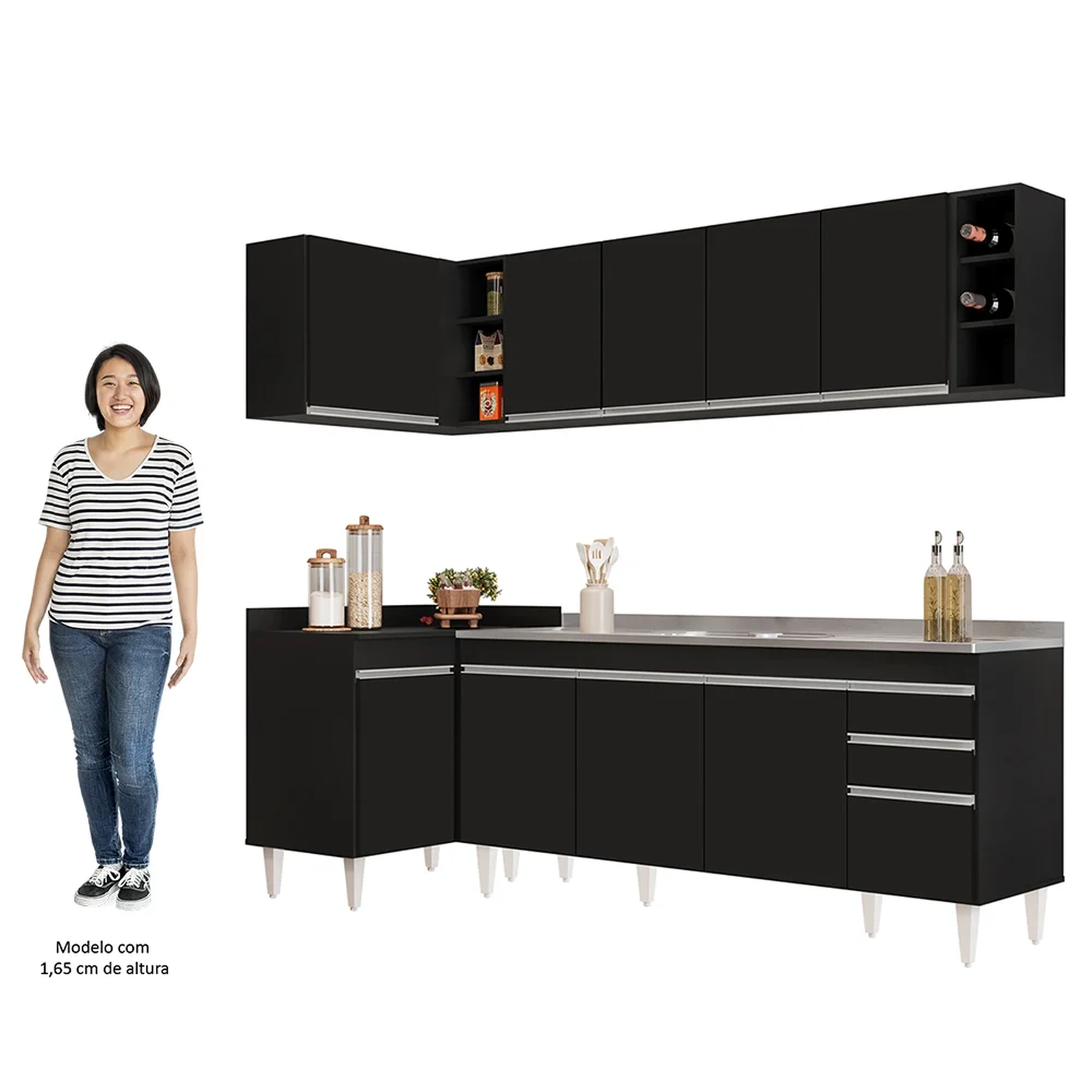 Renove a sua cozinha com o Armário de Cozinha Modulado de Canto Direito 5 Peças CP45 com Pia Inox Preto, da Lumil, você terá tudo o que precisa ao seu alcance. Composto por 5 peças, sendo balcão para pia, armários aéreos, balcão de canto e nicho garrafeiro, esse armário modulado oferece uma distribuição interna perfeita para organizar todos os seus utensílios.