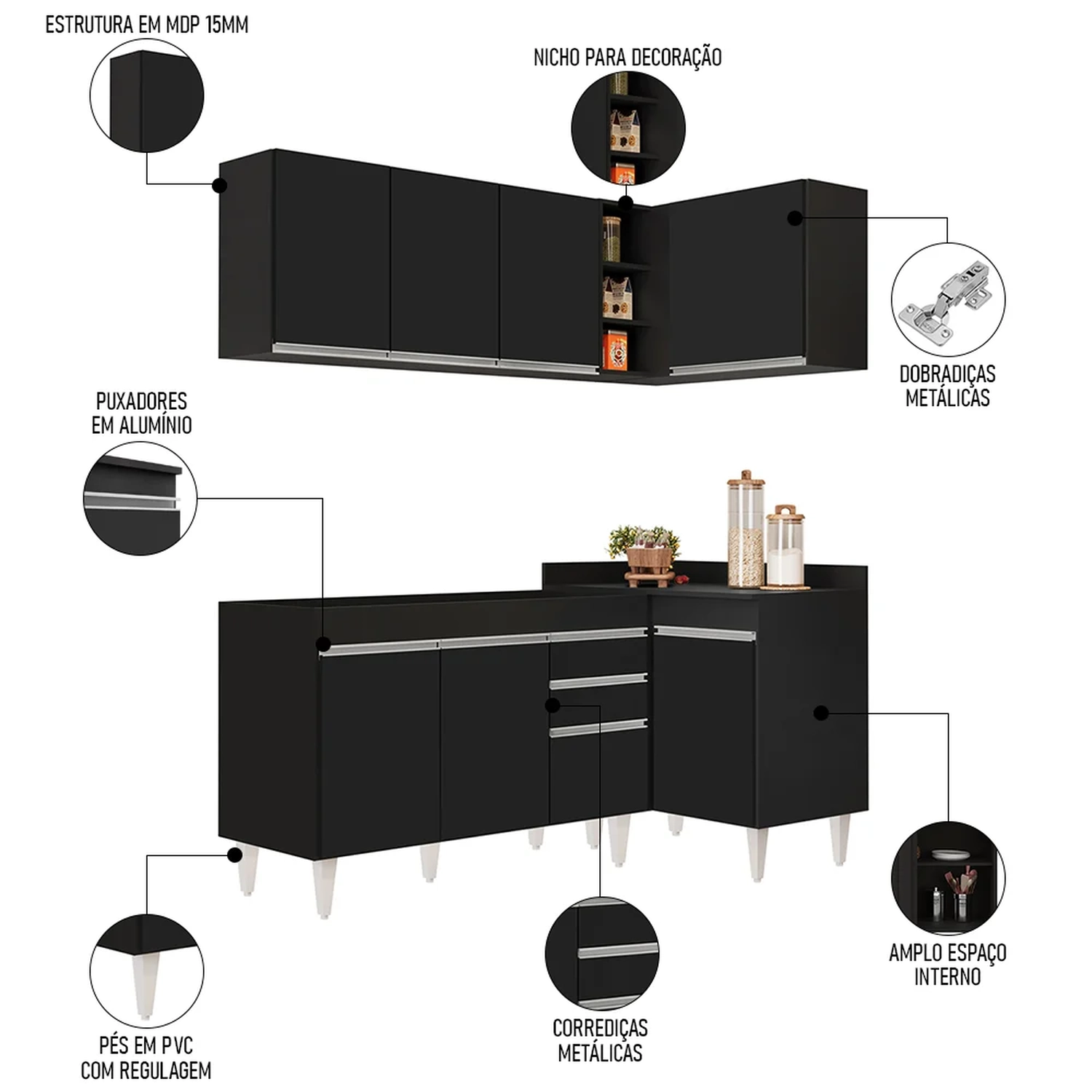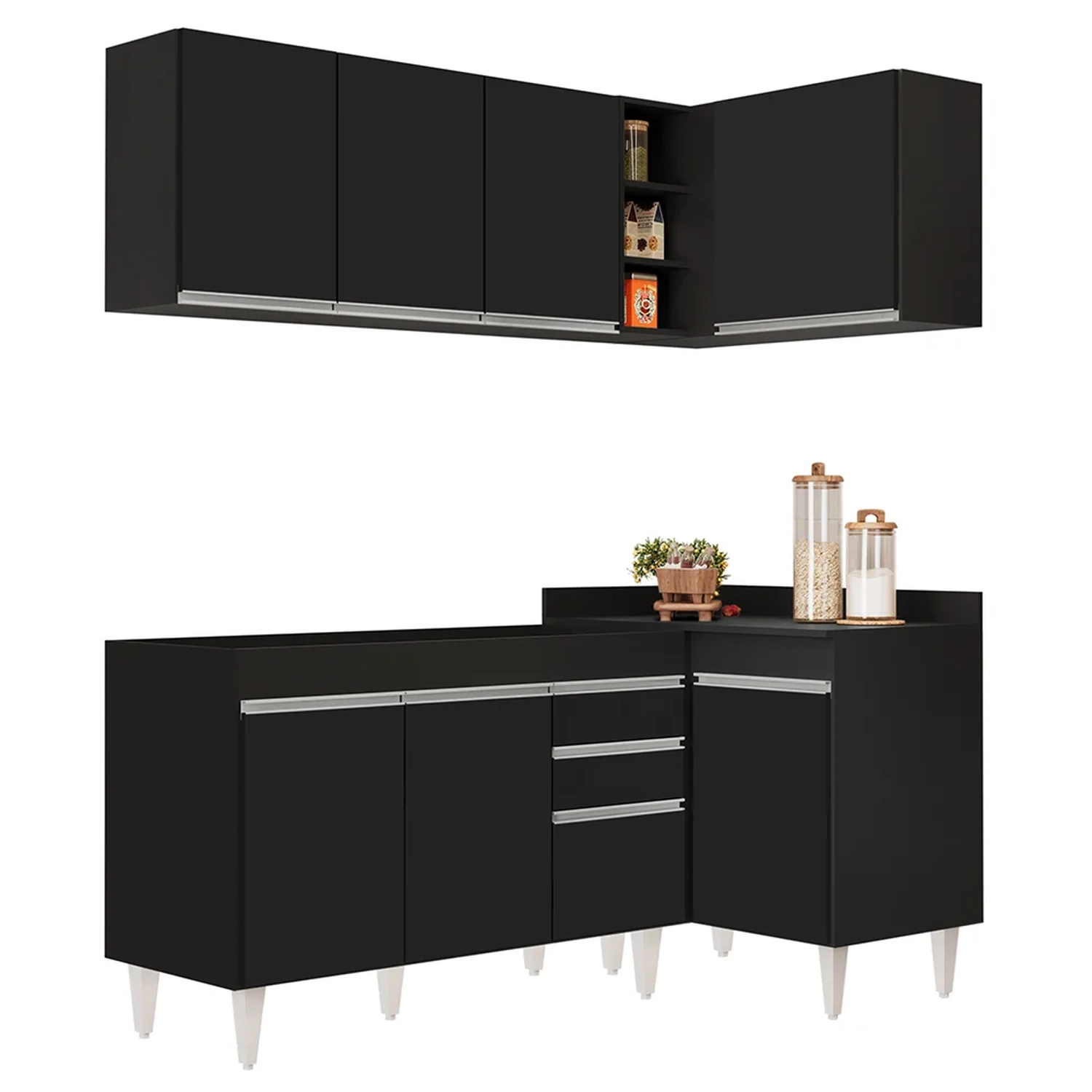 Prático, compacto e funcional, com o Armário de Cozinha Modulado de Canto Esquerdo 4 Peças CP46 Balcão sem Tampo Preto, da Lumil, você terá tudo o que precisa ao seu alcance, uma vez que esse armário modulado oferece uma distribuição interna perfeita para organizar todos os seus utensílios, pois é composto por 4 peças escolhidas minuciosamente, com balcão para pia, balcão de canto, e dois armários aéreos, sendo um de canto com nicho.