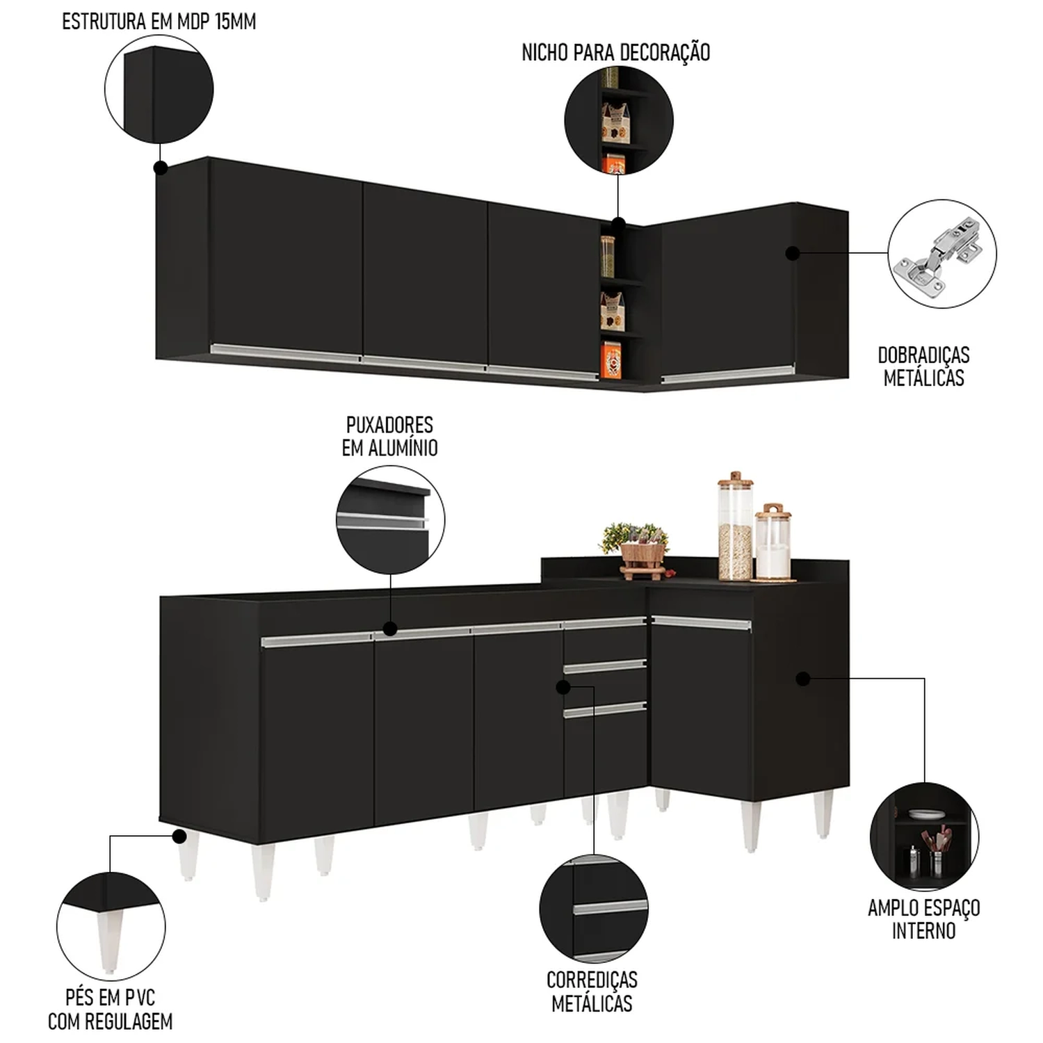 Conteúdo da Embalagem: 1 Balcão 150cm, 1 Armário Aéreo 150cm, 1 Balcão de canto, 1 Armário Aéreo de Canto.