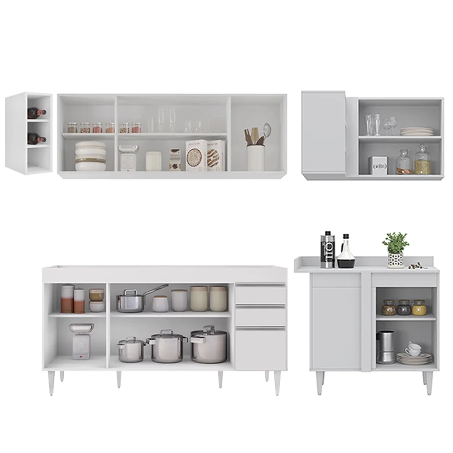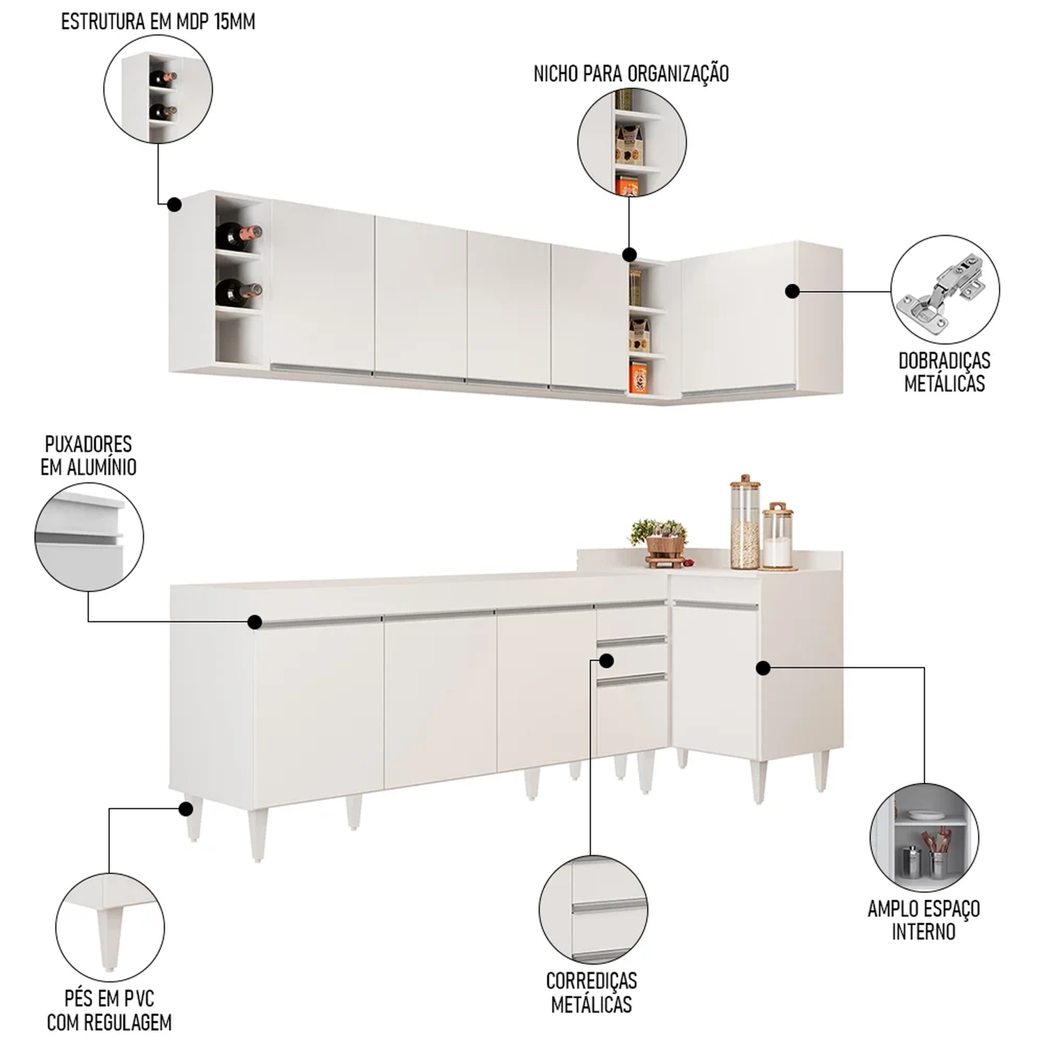 Conteúdo da Embalagem: 1 Balcão 180cm, 1 Armário Aéreo 160cm, 1 Balcão de canto, 1 Armário Aéreo de Canto, 1 Nicho.