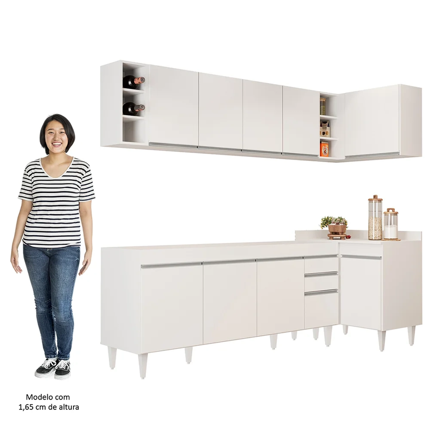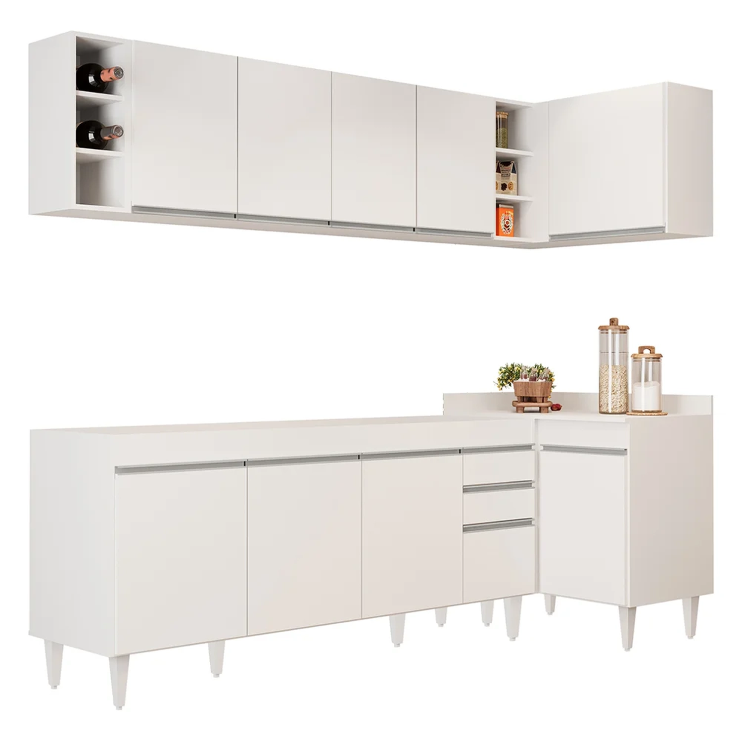 Renove a sua cozinha com o Armário de Cozinha Modulado de Canto Esquerdo 5 Peças CP52 Balcão sem Tampo Branco , da Lumil, você terá tudo o que precisa ao seu alcance. Composto por 5 peças, sendo balcão para pia 180cm, armários aéreos, balcão de canto e nicho garrafeiro , esse armário modulado oferece uma distribuição interna perfeita para organizar todos os seus utensílios.