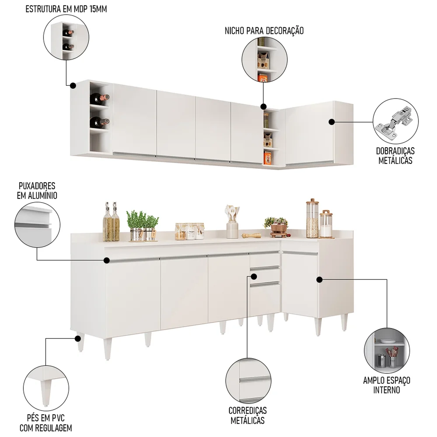 Conteúdo da Embalagem: 1 Balcão 180cm, 1 Armário Aéreo 160cm, 1 Balcão de canto, 1 Armário Aéreo de Canto, 1 Nicho, 1 Tampo 180cm.