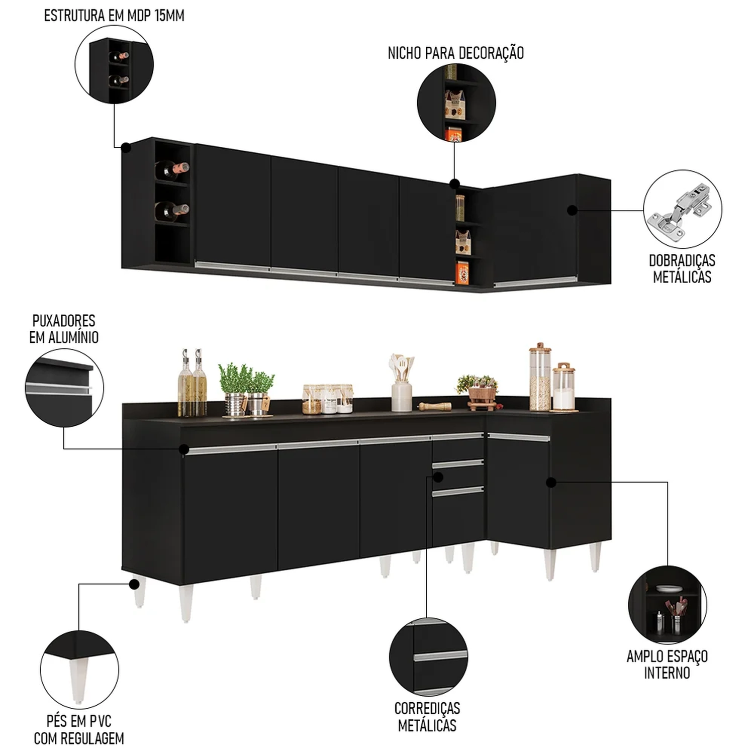 Conteúdo da Embalagem: 1 Balcão 180cm, 1 Armário Aéreo 160cm, 1 Balcão de canto, 1 Armário Aéreo de Canto, 1 Nicho, 1 Tampo 180cm.