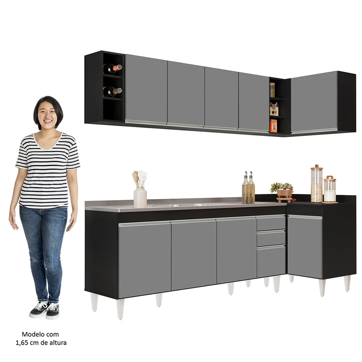 Renove a sua cozinha com o Armário de Cozinha Modulado de Canto Esquerdo 5 Peças CP54 com Pia Inox Preto/Cinza, da Lumil, você terá tudo o que precisa ao seu alcance. Composto por 5 peças, sendo balcão para pia, armários aéreos, balcão de canto e nicho garrafeiro, esse armário modulado oferece uma distribuição interna perfeita para organizar todos os seus utensílios.