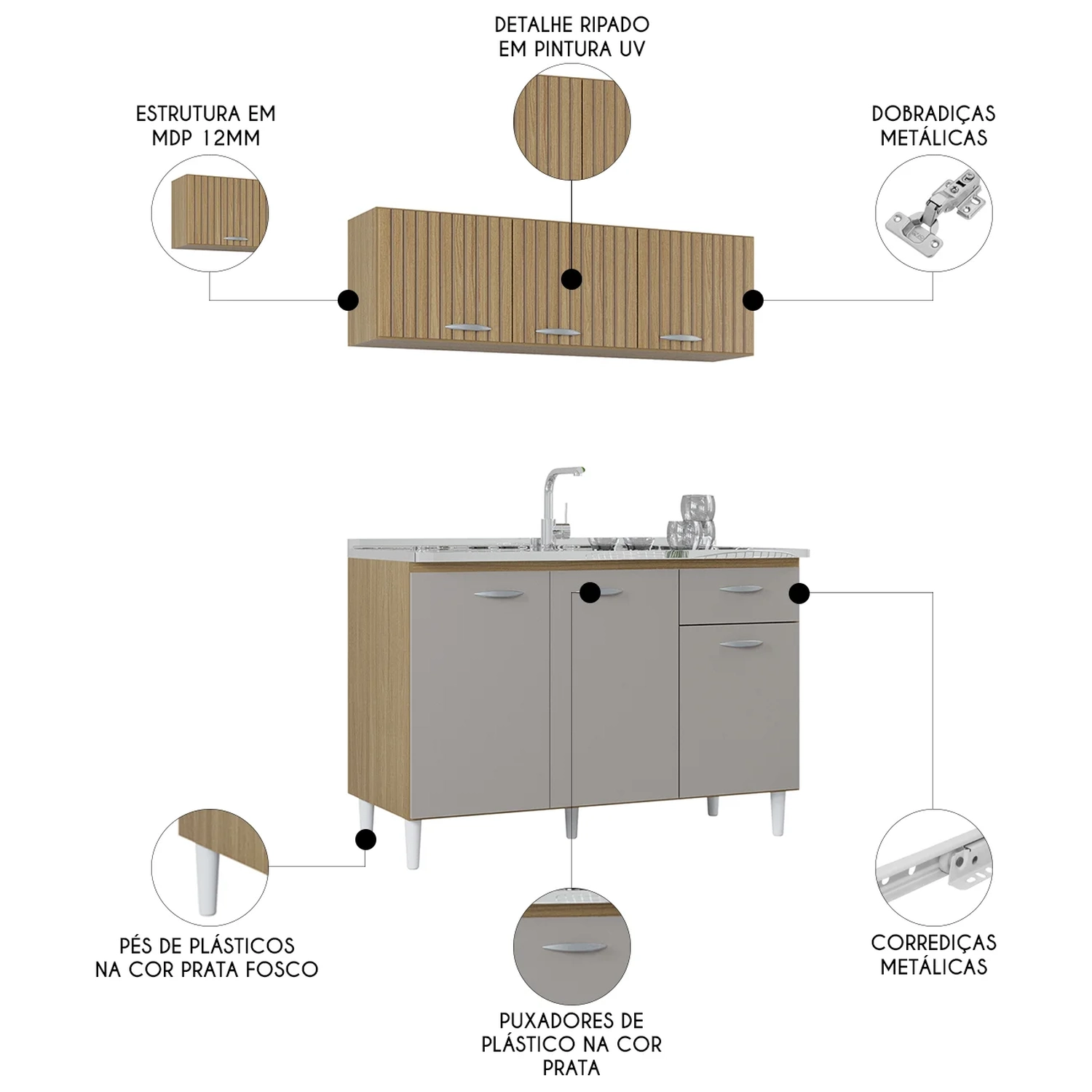 Armário e Balcão Com Pia 120cm Classic Ripado Damasco/Off Z46 - Mpozenato