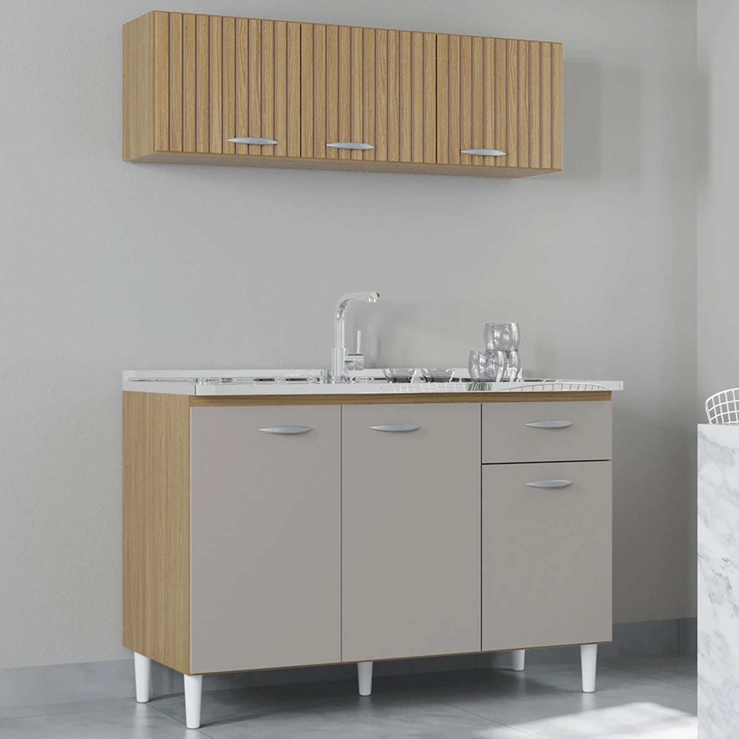 Já o Armário Suspenso com três portas e uma gaveta oferece espaço extra para louças, copos e mantimentos, mantendo tudo organizado. Sua estrutura é resistente e o acabamento clássico com design ripado em pintura UV traz um toque refinado para a Cozinha Compacta.