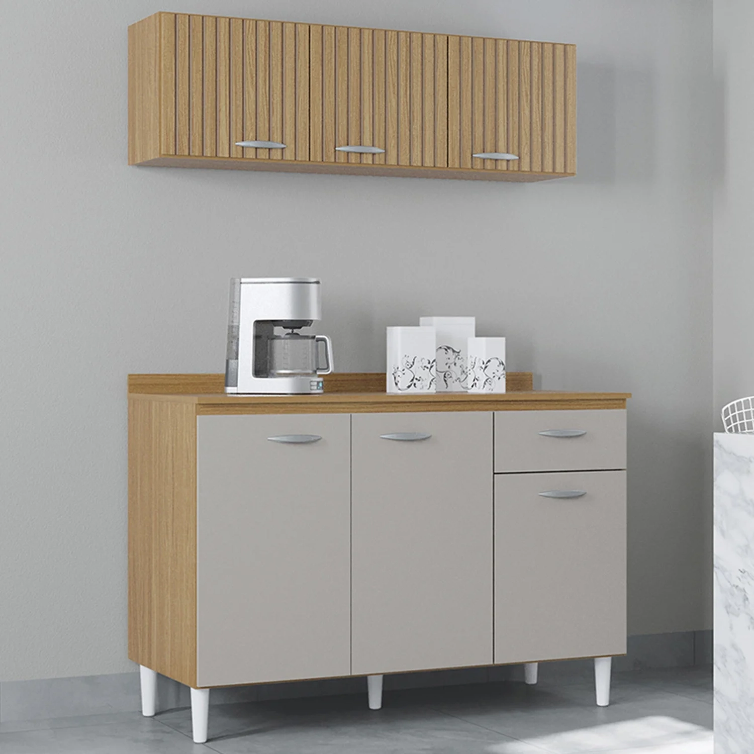 O Armário Suspenso com três portas e uma gaveta complementa o espaço, garantindo mais organização para louças, copos e mantimentos. Sua estrutura robusta proporciona durabilidade, enquanto o acabamento ripado em pintura UV adiciona elegância à Cozinha Compacta.