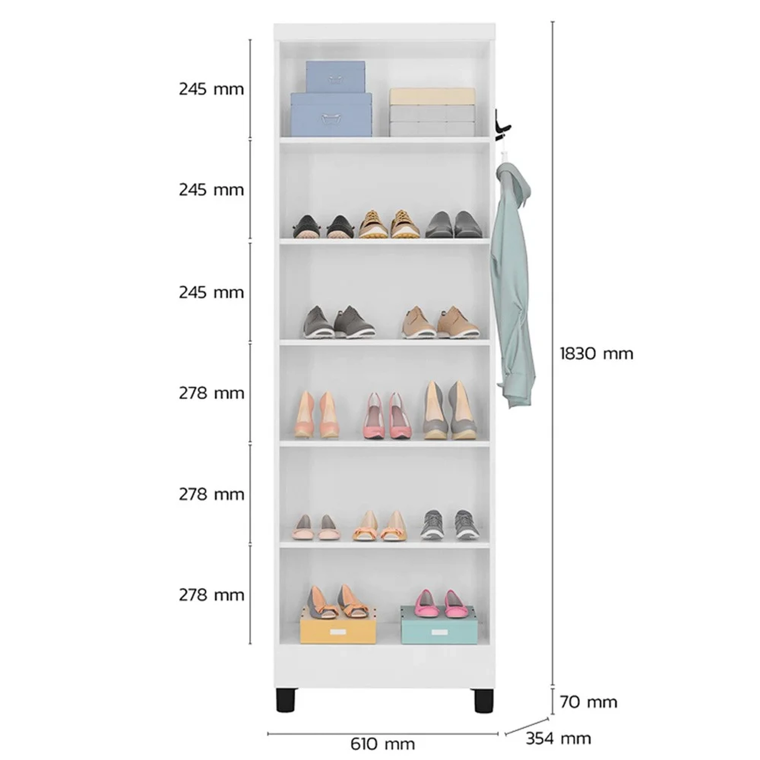 Peso suportado distribuído: 7 Kg por prateleiras.