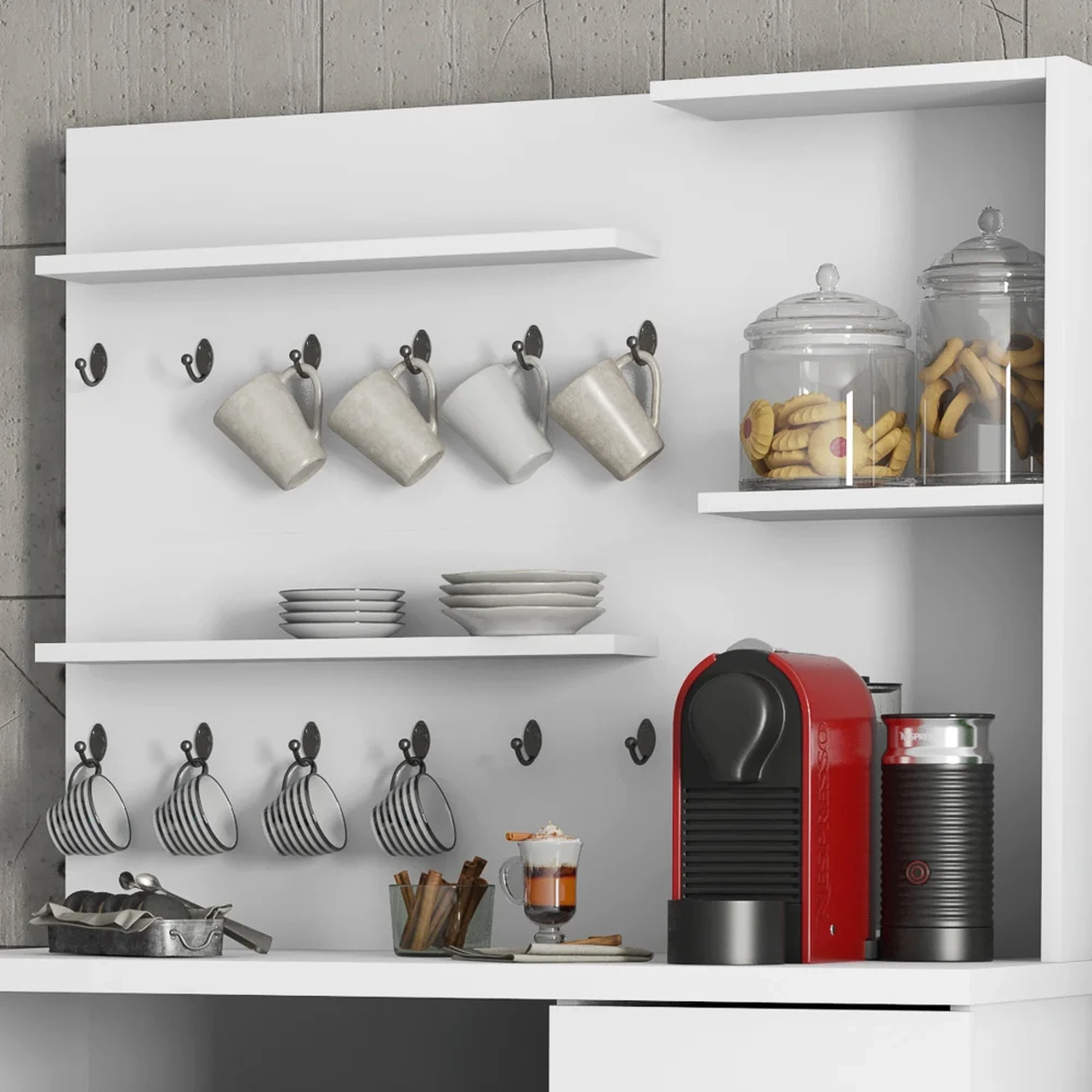Isso mesmo, conheça o Cantinho do Café Aconchego da Patrimar e se encante com todos os benefícios que ele oferece! O Cantinho do Café e mais do que um simples complemento, é um móvel inovador capaz de transformar o ambiente, confira! Estrutura em MDP/MDF com acabamento em pintura BP garantem durabilidade e resistência ao produto, ele possui espaço para forno ou micro ondas e também conta com 2 portas convencionais com amplo espaço interno para armazenar itens diversos. Ah, mas o diferencial são as prateleiras e ganchos superiores para pendurar suas xícaras ou panos de prato. Demais, né?