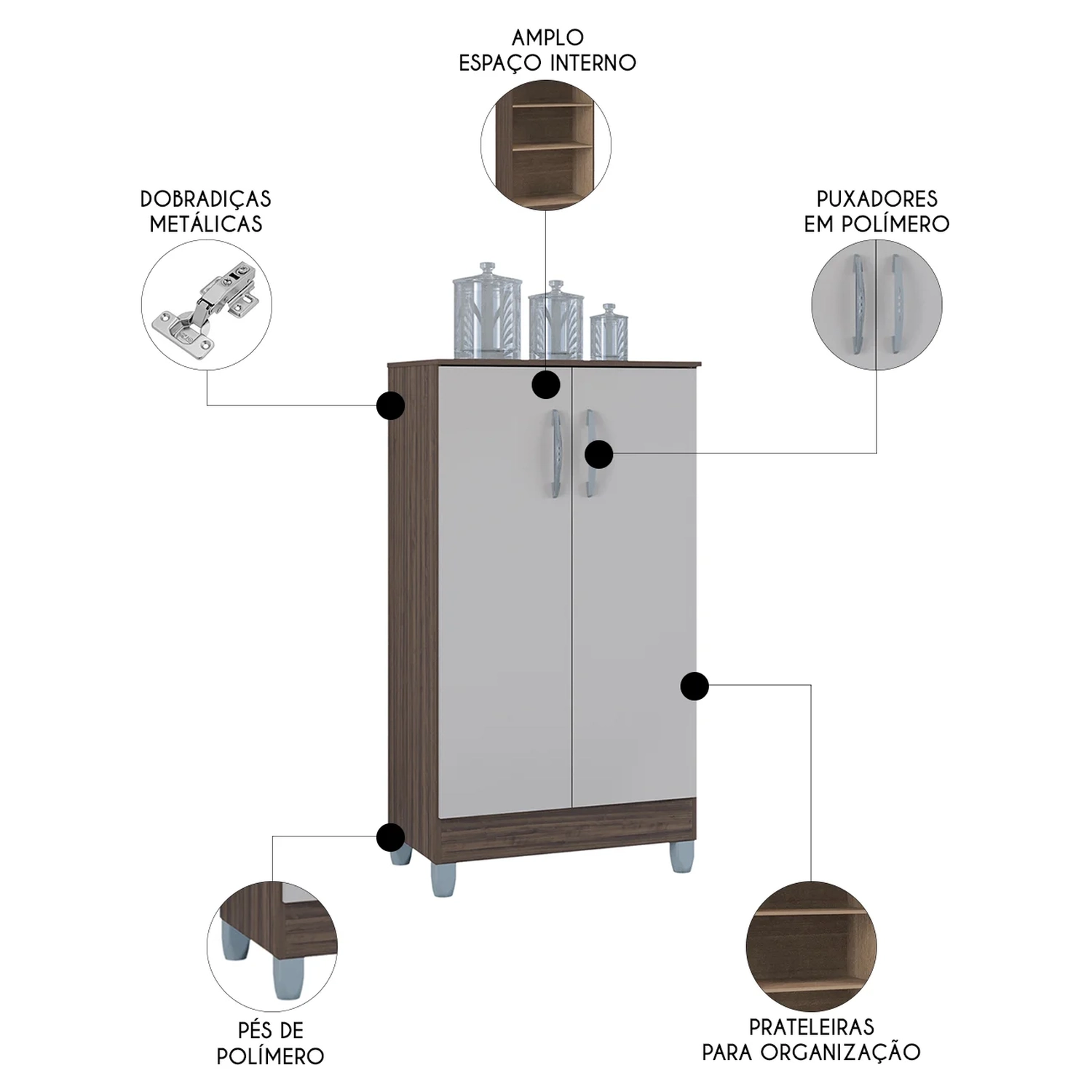 Este armário multiuso vai adicionar um toque de elegância e estilo à sua cozinha, Sala de Estar, Escritório sem comprometer a estética do ambiente. Fabricado em MDP, ele oferece a durabilidade e a resistência que você precisa para o uso diário. As portas contam com dobradiças metálicas de alta qualidade, garantindo um fechamento suave e seguro. Os puxadores de plástico são projetados para complementar o design moderno do Armário Multiuso, enquanto os pés de plástico cinza adicionam um toque especial e asseguram uma boa estabilidade. O acabamento em pintura UV não só protege o armário multiuso contra o desgaste, mas também proporciona um brilho discreto que realça a beleza do móvel. Com duas prateleiras internas, ele oferece um bom espaço de armazenamento, permitindo que você organize seus itens também em lavanderia ou até mesmo em sua Cozinha de maneira eficiente e pratica. A praticidade e qualidade se encontram neste móvel indispensável.