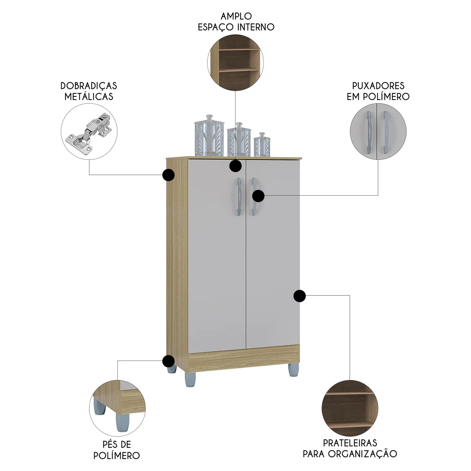 Este armário multiuso vai adicionar um toque de elegância e estilo à sua cozinha, Sala de Estar, Escritório sem comprometer a estética do ambiente. Fabricado em MDP, ele oferece a durabilidade e a resistência que você precisa para o uso diário. As portas contam com dobradiças metálicas de alta qualidade, garantindo um fechamento suave e seguro. Os puxadores de plástico são projetados para complementar o design moderno do Armário Multiuso, enquanto os pés de plástico cinza adicionam um toque especial e asseguram uma boa estabilidade. O acabamento em pintura UV não só protege o armário multiuso contra o desgaste, mas também proporciona um brilho discreto que realça a beleza do móvel. Com duas prateleiras internas, ele oferece um bom espaço de armazenamento, permitindo que você organize seus itens também em lavanderia ou até mesmo em sua Cozinha de maneira eficiente e pratica. A praticidade e qualidade se encontram neste móvel indispensável.