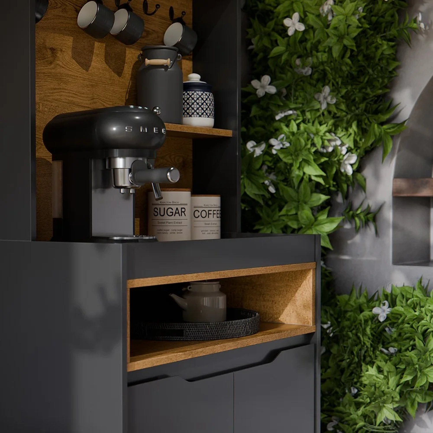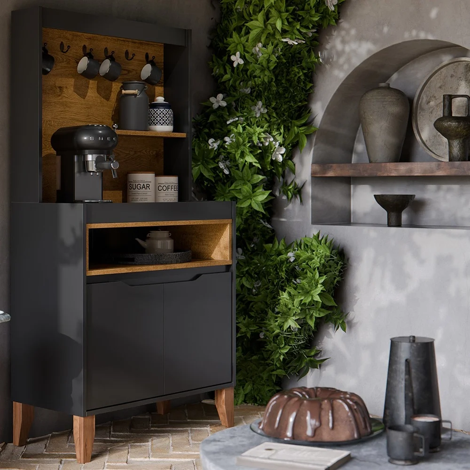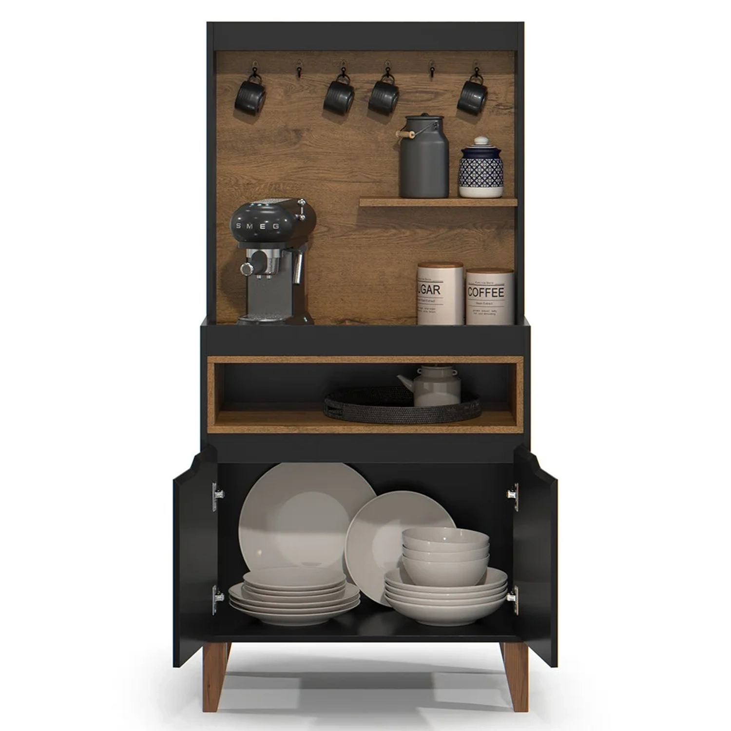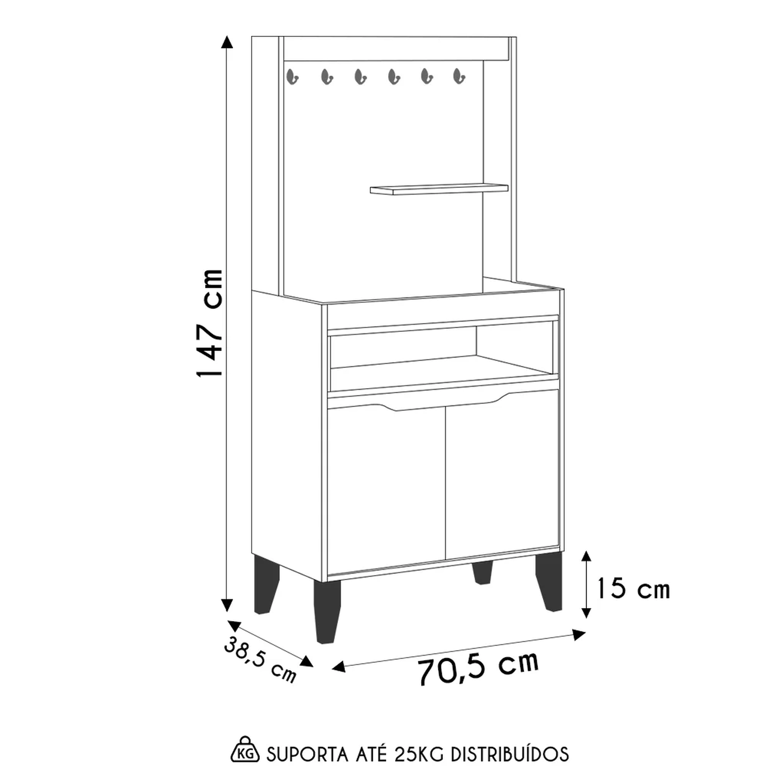 O design moderno desse balcão cantinho do café vai adicionar um toque de elegância e estilo à sua cozinha, sala de estar, escritório ou até mesmo ao espaço gourmet. Com suas linhas retas e acabamento impecável, esse armário multiuso é capaz de combinar com qualquer estilo de decoração, tornando-se a peça essencial para quem busca praticidade. Além disso, com o excelente espaço interno, uma prateleira, nicho decorativo e, ainda, ganchos especialmente projetados para suspender suas xícaras favoritas, você terá fácil acesso a tudo que precisa para ter um momento de relaxar, enquanto aprecia a pausa para o cafezinho. Chega de perder tempo procurando pelos seus utensílios preferidos! Com o cantinho do café, tudo estará organizado e ao seu alcance!