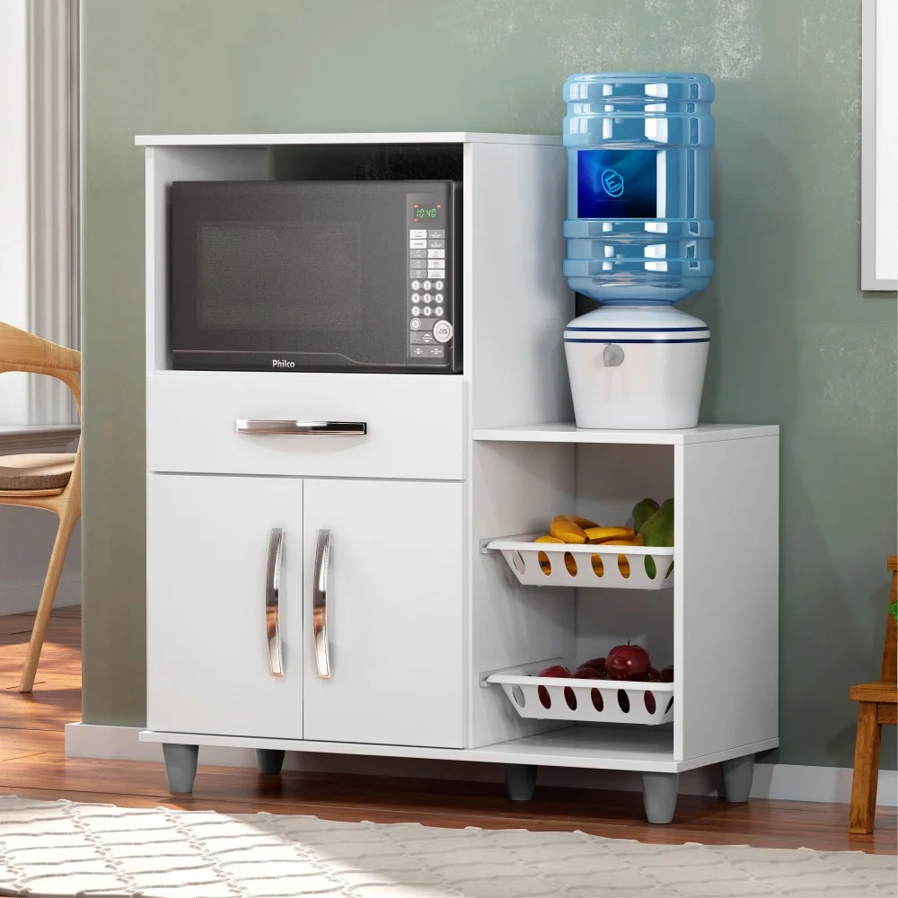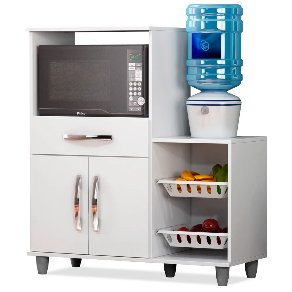 Pensando nisso, o Armário Multiuso Ibiza com Fruteira Branco da Lumil Móveis é a escolhe certeira, sendo moderna e funcional para levar mais praticidade à sua cozinha. O móvel possui nicho com espaço para microondas ou forno elétrico, otimizado com 1 gaveta, 3 portas convencionais e 2 cestos para fruteira. Além disso, conta com estrutura em MDP/MDF, corrediçãs metálicas, puxadores em PVC cromado e com acabamento BP garantindo maior durabilidade ao produto.