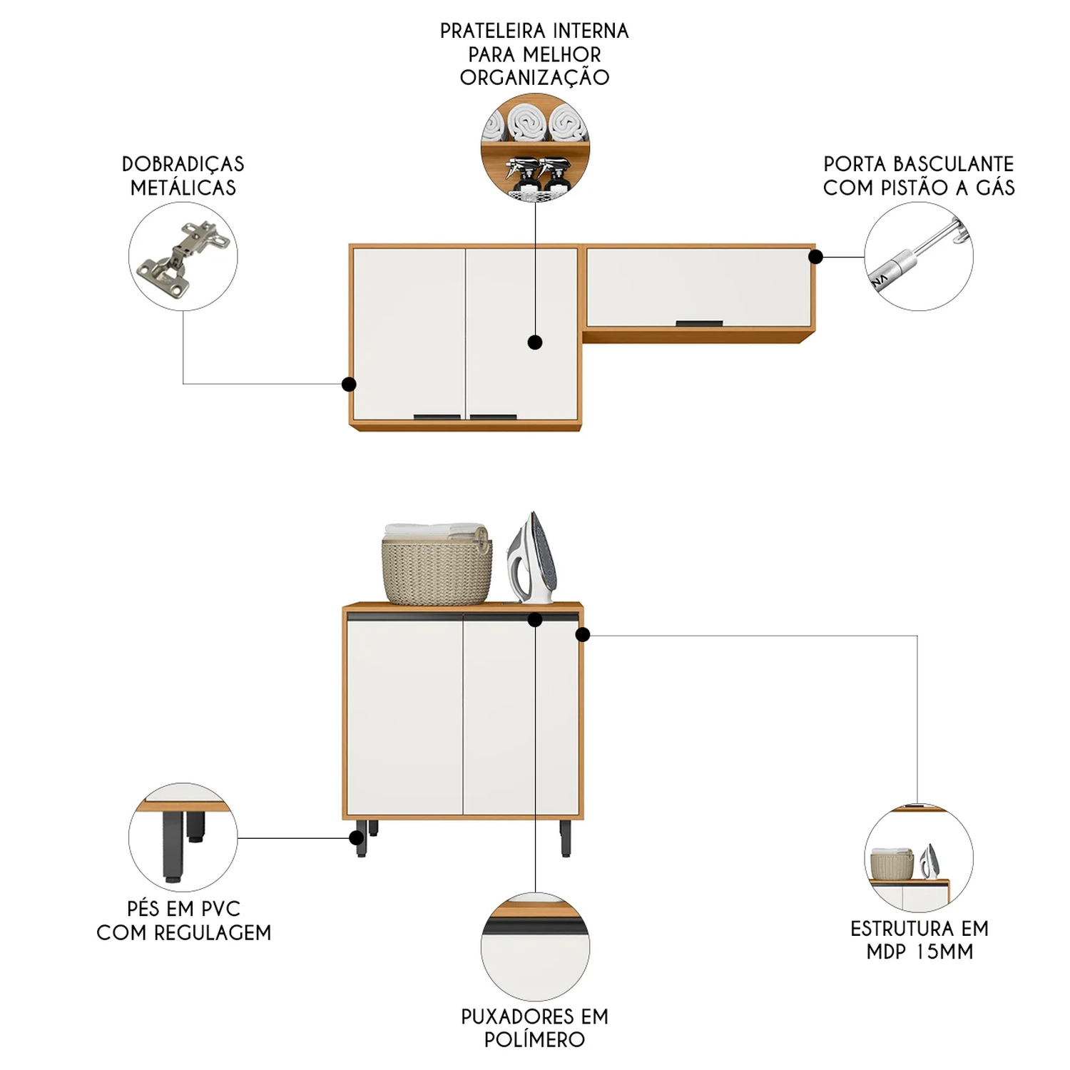 Todos os módulos são fabricados em MDP com acabamento em pintura UV, garantindo máxima resistência e proteção. As dobradiças metálicas e o pistão a gás proporcionam uma abertura suave e controlada para as portas.