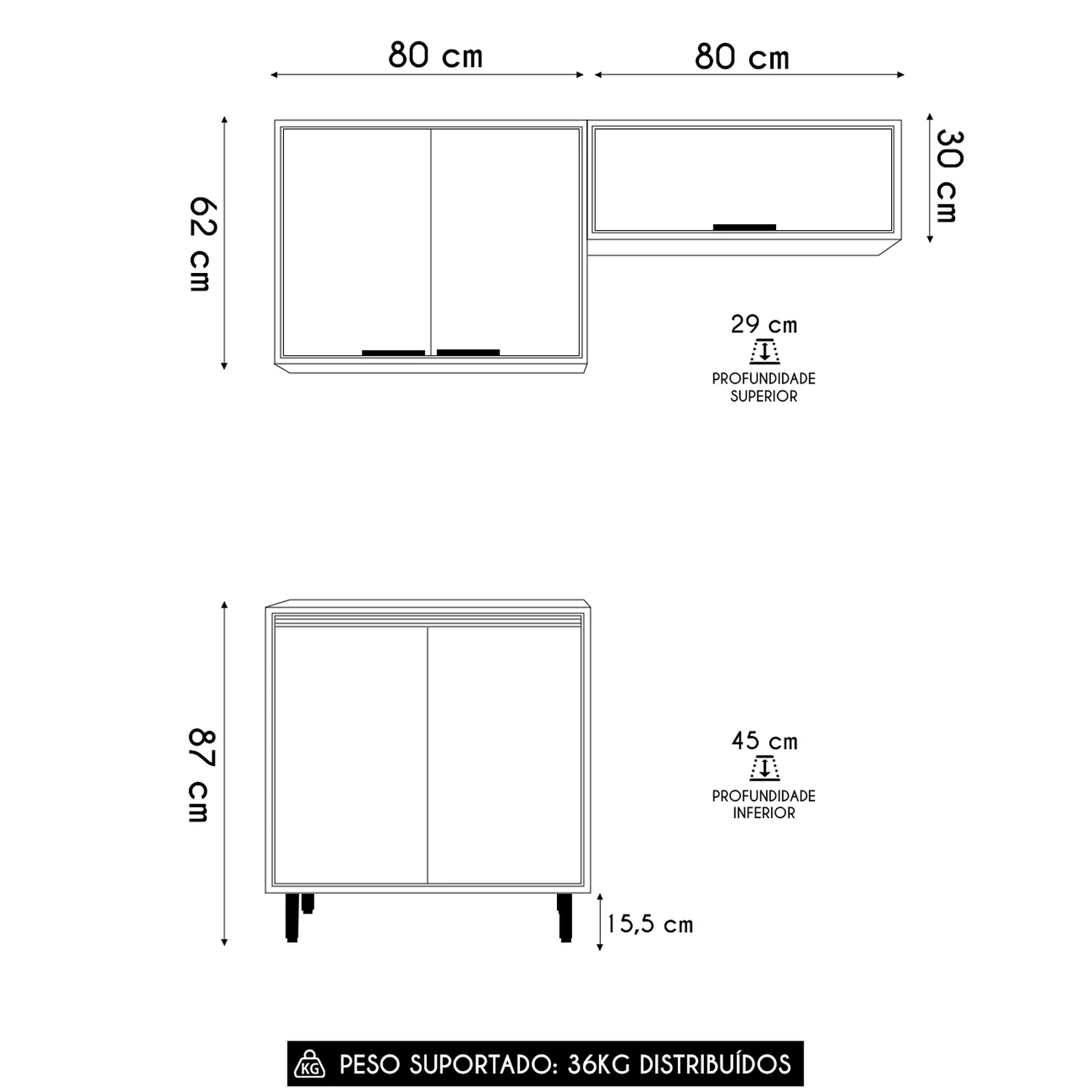 Conteúdo da Embalagem: 1 Armário Aéreo 80cm, 1 Armário de Geladeira, 1 Balcão.