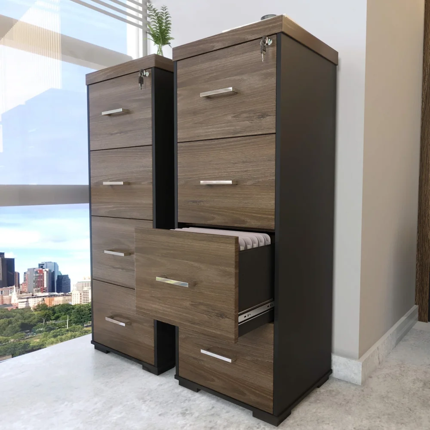 Com um design robusto e resistente, fabricado com matérias-primas de qualidade, esse armário para pasta suspensa comporta muitos arquivos, além de agregar um toque de charme na decoração do ambiente. Ahh, e você pode ficar tranquilo, porque caso não queira deixar os arquivos à mercê de pessoas não autorizadas, basta travar todas as gavetas com a chave e guardá-la contigo. Bom demais, não é mesmo.