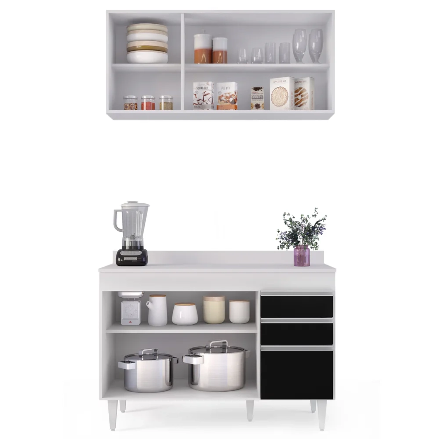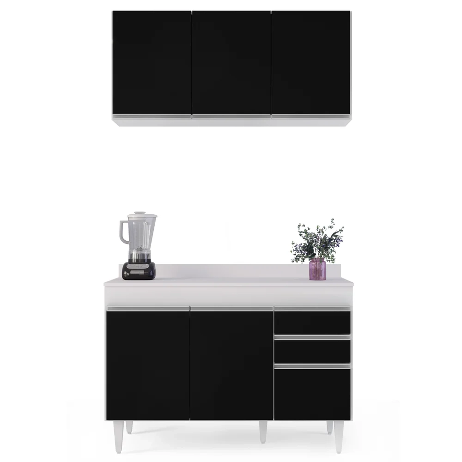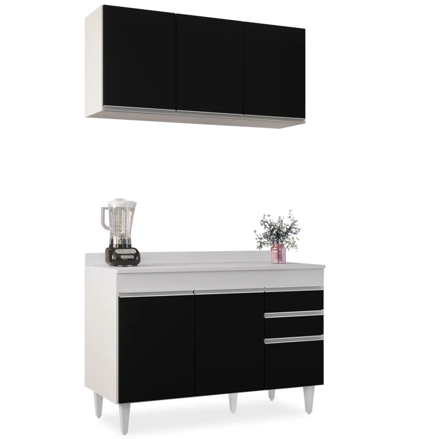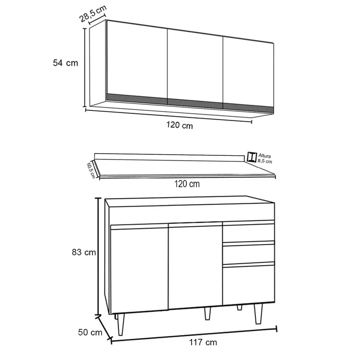 Conteúdo da Embalagem: 1 Armário Aéreo, 1 Balcão, 1 Tampo.