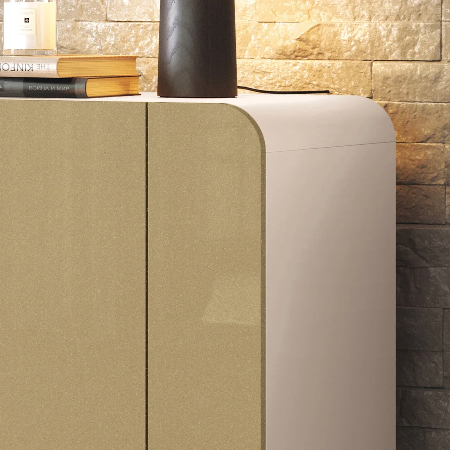 Possui duas portas com dobradiças laterais e puxadores em alumínio dourado. O sistema de amortecimento oferece fechamento suave e silencioso.