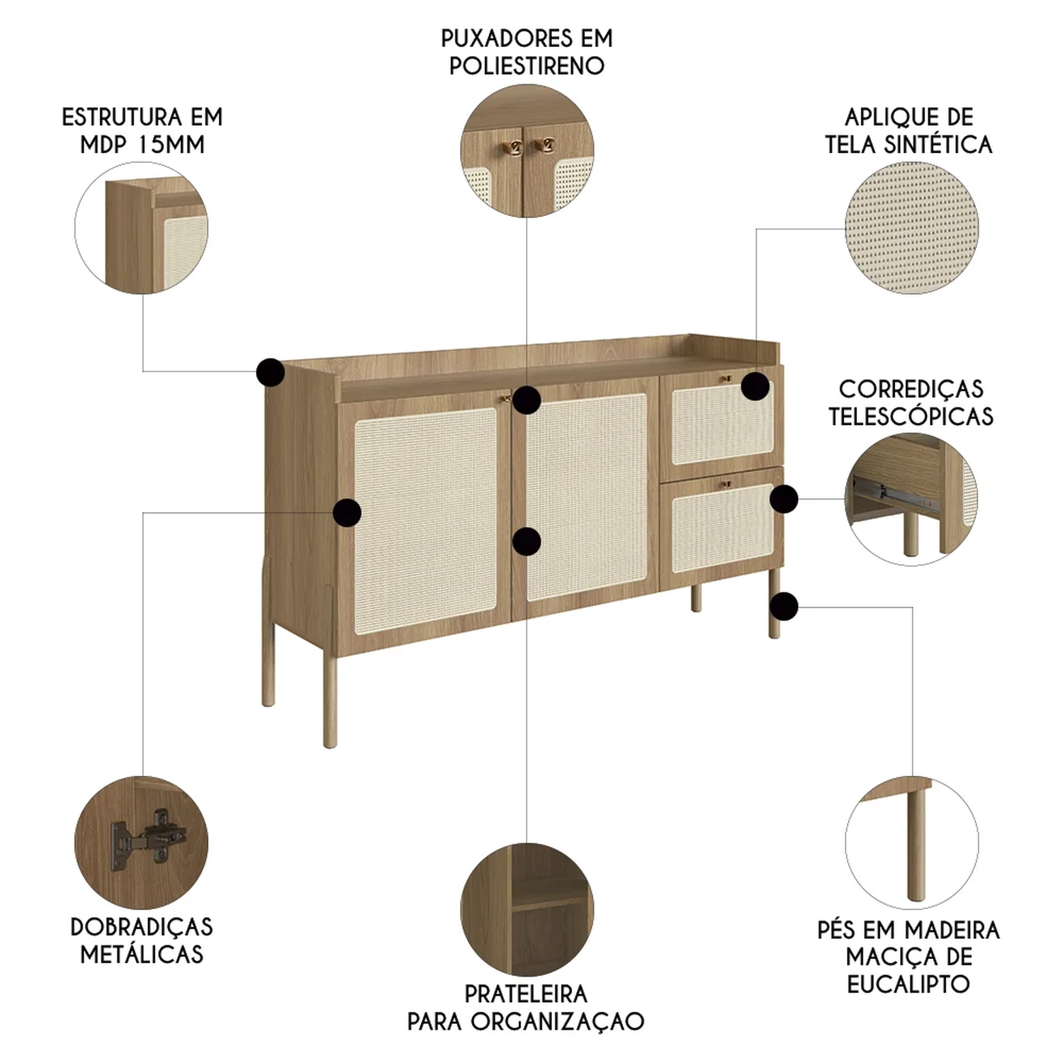 Esse Balcão Buffet é ideal para quem deseja adicionar um elemento de sofisticação à Sala de Estar. Construído com uma estrutura robusta em MDP de 15mm e um acabamento BP de alta qualidade, ele também possui 2 portas convencionais equipadas com dobradiças metálicas resistentes à corrosão. As gavetas, com corrediças telescópicas, proporcionam um espaço interno generoso e são equipadas com puxadores de poliestireno que facilitam o manuseio. Além disso, o Aparador se destaca pelos detalhes em tela sintética de PVC com poliéster, que são aplicados nas portas e gavetas, conferindo um toque retrô ao Aparador Bar. Os pés em madeira maciça de eucalipto, com sapatas emborrachadas nas extremidades, garantem estabilidade e evitam o atrito do móvel com o piso. Este balcão não é apenas funcional, mas também é uma peça de destaque que pode realçar a decoração de qualquer ambiente.