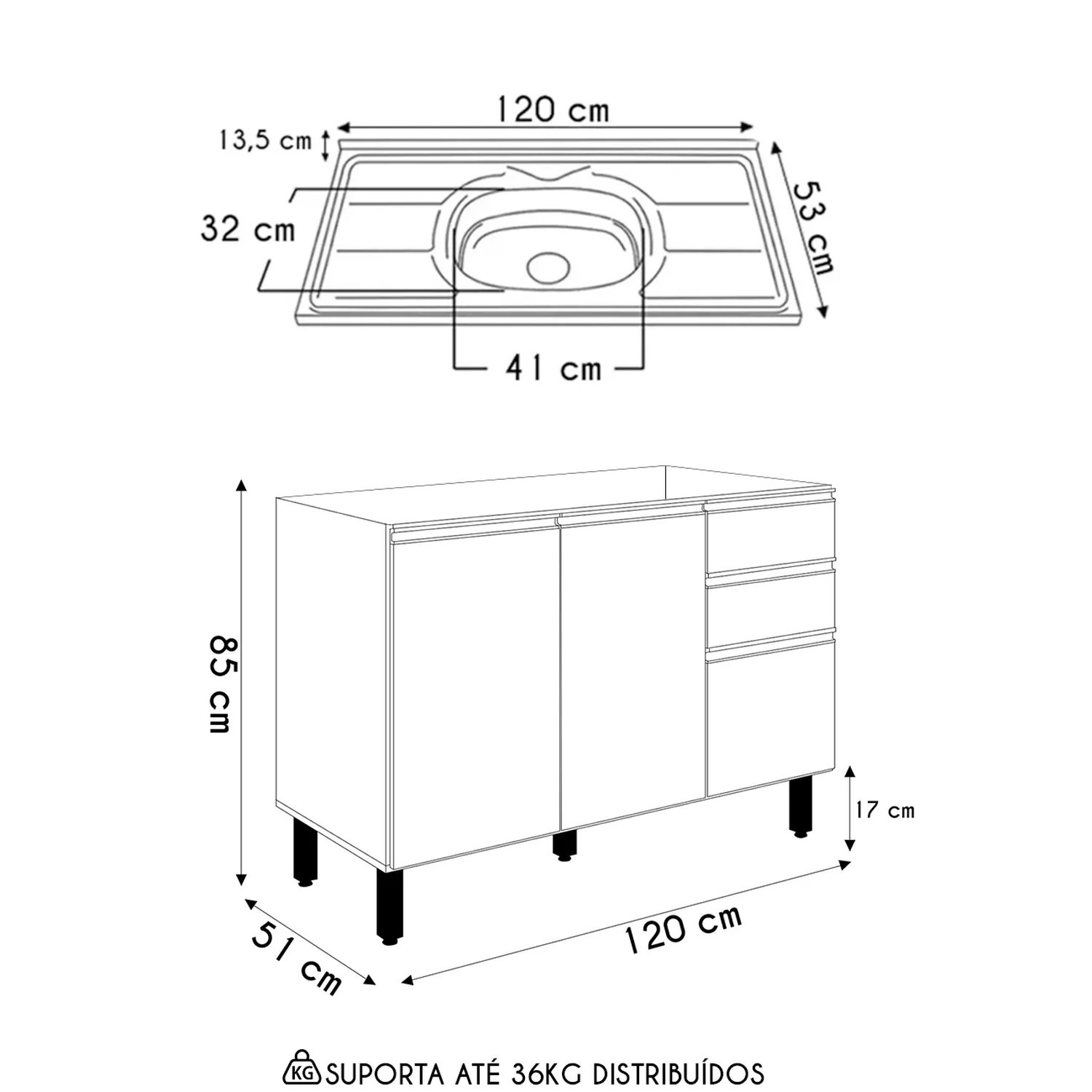 O Balcão de Cozinha oferece duas portas com dobradiças metálicas e amortecedores integrados, garantindo um fechamento suave e silencioso. Além disso, conta com três gavetas espaçosas, incluindo um gavetão, todas equipadas com corrediças metálicas telescópicas que proporcionam uma abertura e fechamento suaves. Os puxadores em alumínio adicionam um toque de sofisticação ao design do Balcão Gabinete, enquanto os pés em PVC reguláveis permitem o ajuste perfeito à altura desejada, assegurando estabilidade mesmo em pisos irregulares. O Balcão ainda acompanha uma pia inox 120cm, com cuba e válvula para auxiliar no preparo das refeições, facilitando ainda mais o dia a dia e mantendo a organização da Cozinha.