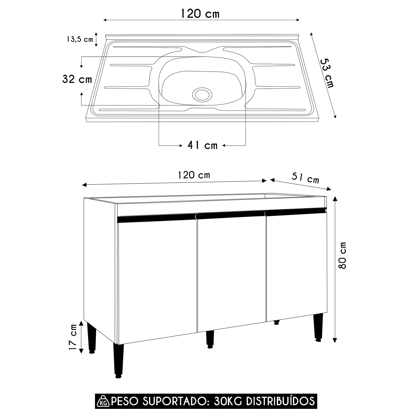 Pia: 120 cm x 13,5 cm x 53 cm.