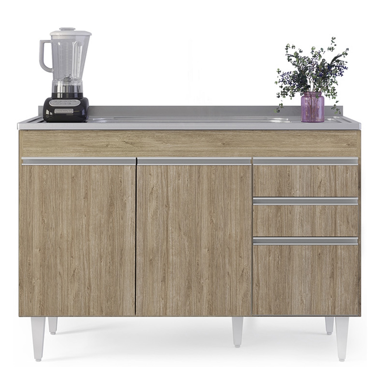 Possui duas gavetas, três portas e uma prateleira interna que ampliam o aproveitamento do espaço, além de acompanhar Pia Inox com cuba central e válvula metálica.