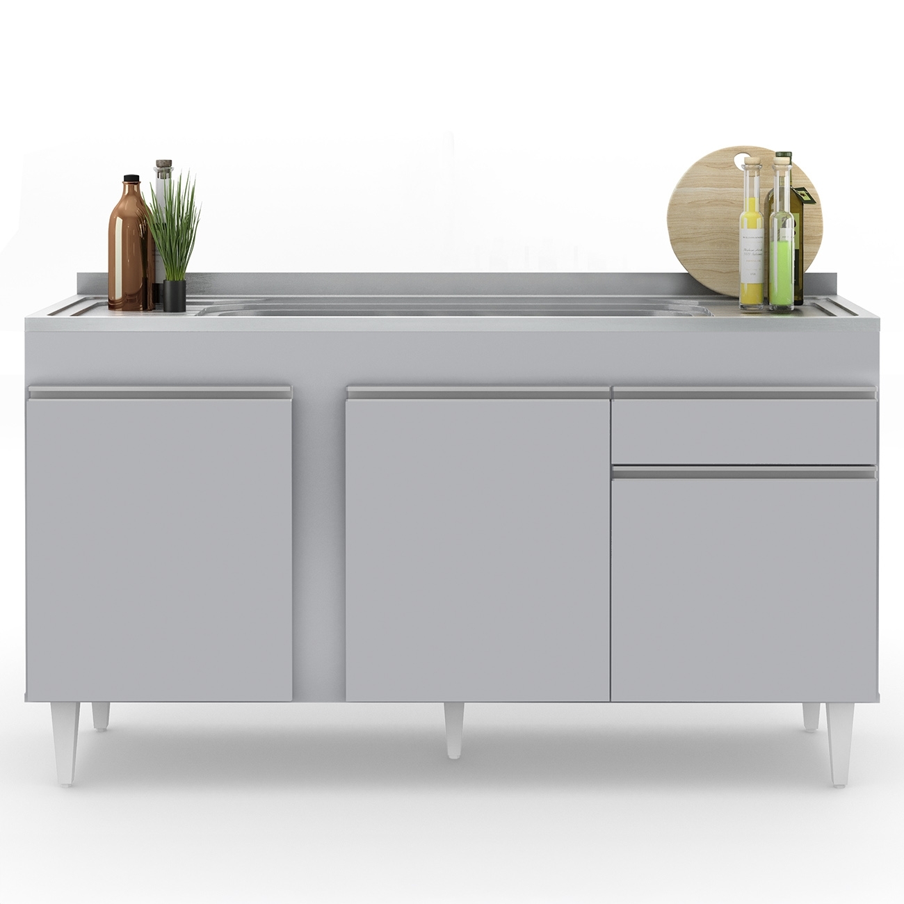 Possui uma gaveta, três portas e uma prateleira interna que ampliam o aproveitamento do espaço, além de acompanhar Pia Inox com cuba central e válvula metálica.