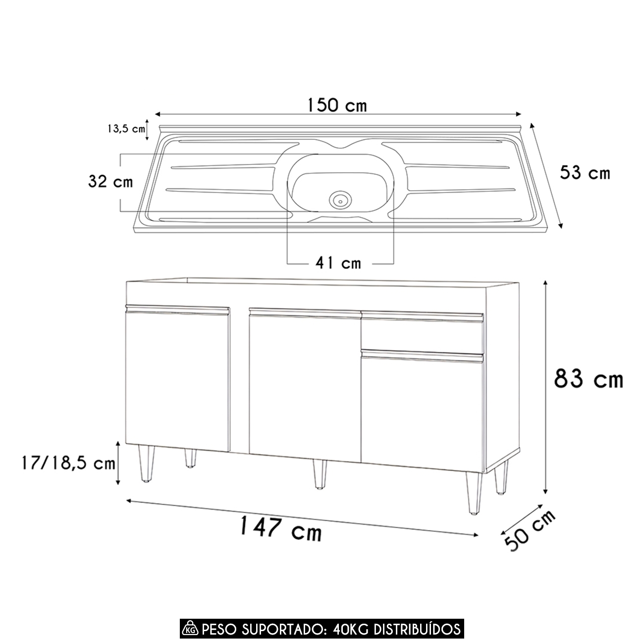 Balcão: 147 cm x 83 cm x 50 cm.