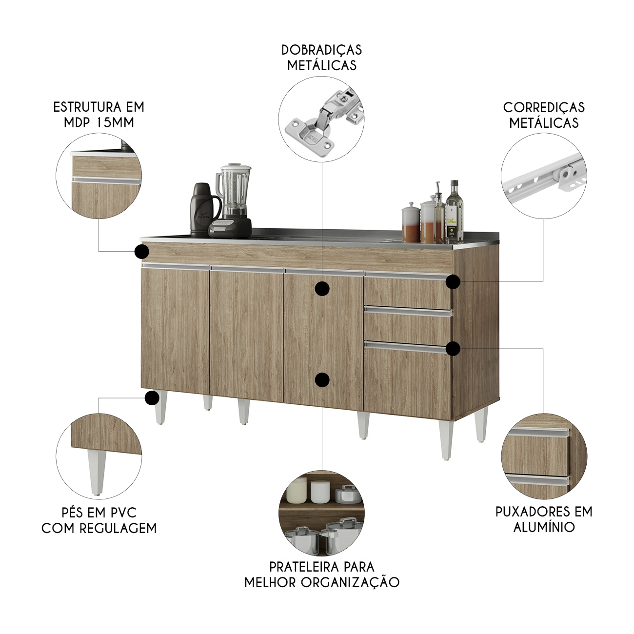 Produzido em MDP de alta resistência com dobradiças metálicas e pés reguláveis, apresenta excelente durabilidade e estrutura sólida para uma Cozinha Compacta.