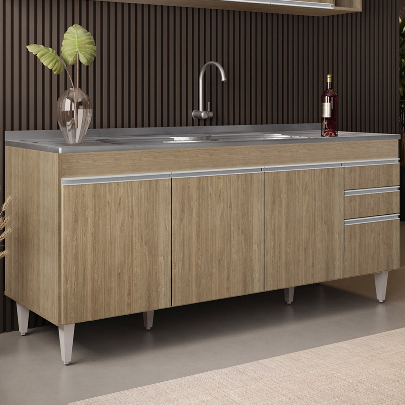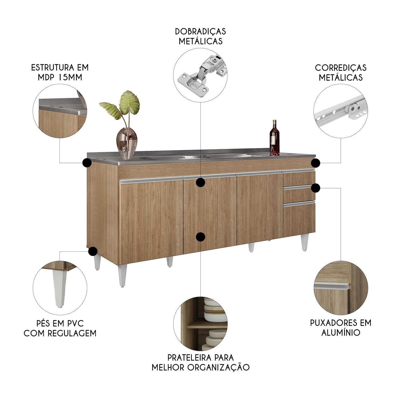 Possui duas gavetas, quatro portas e uma prateleira interna que ampliam o aproveitamento do espaço, além de acompanhar Pia Inox com cuba central e válvula metálica.