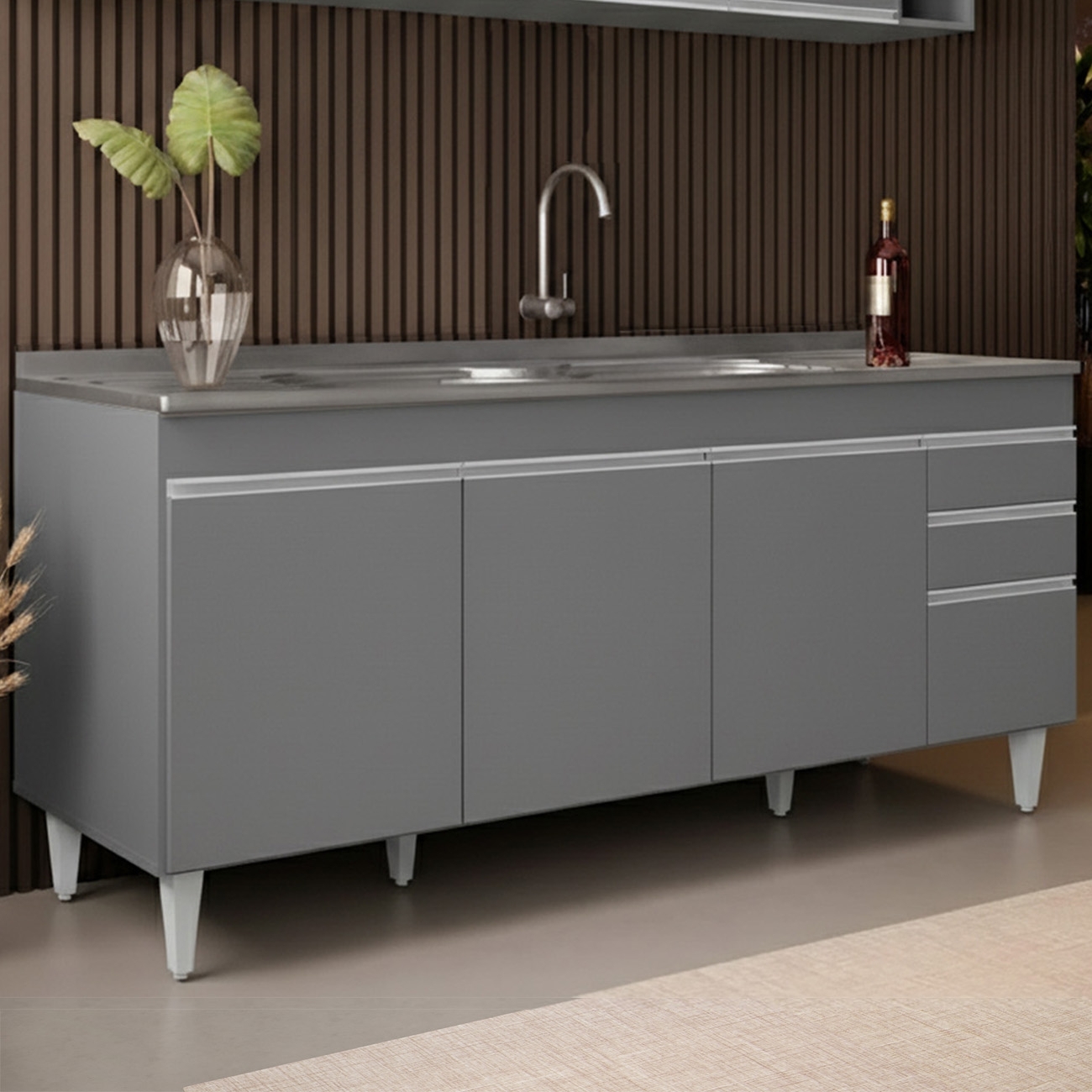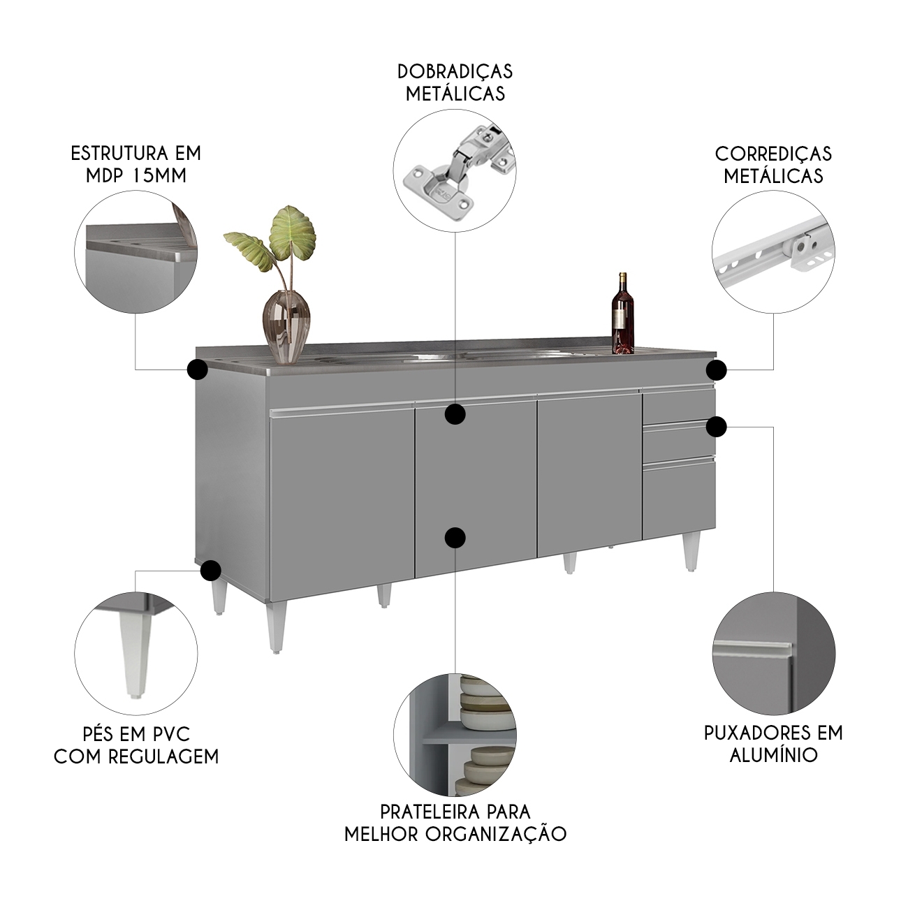 Possui duas gavetas, quatro portas e uma prateleira interna que ampliam o aproveitamento do espaço, além de acompanhar Pia Inox com cuba central e válvula metálica.