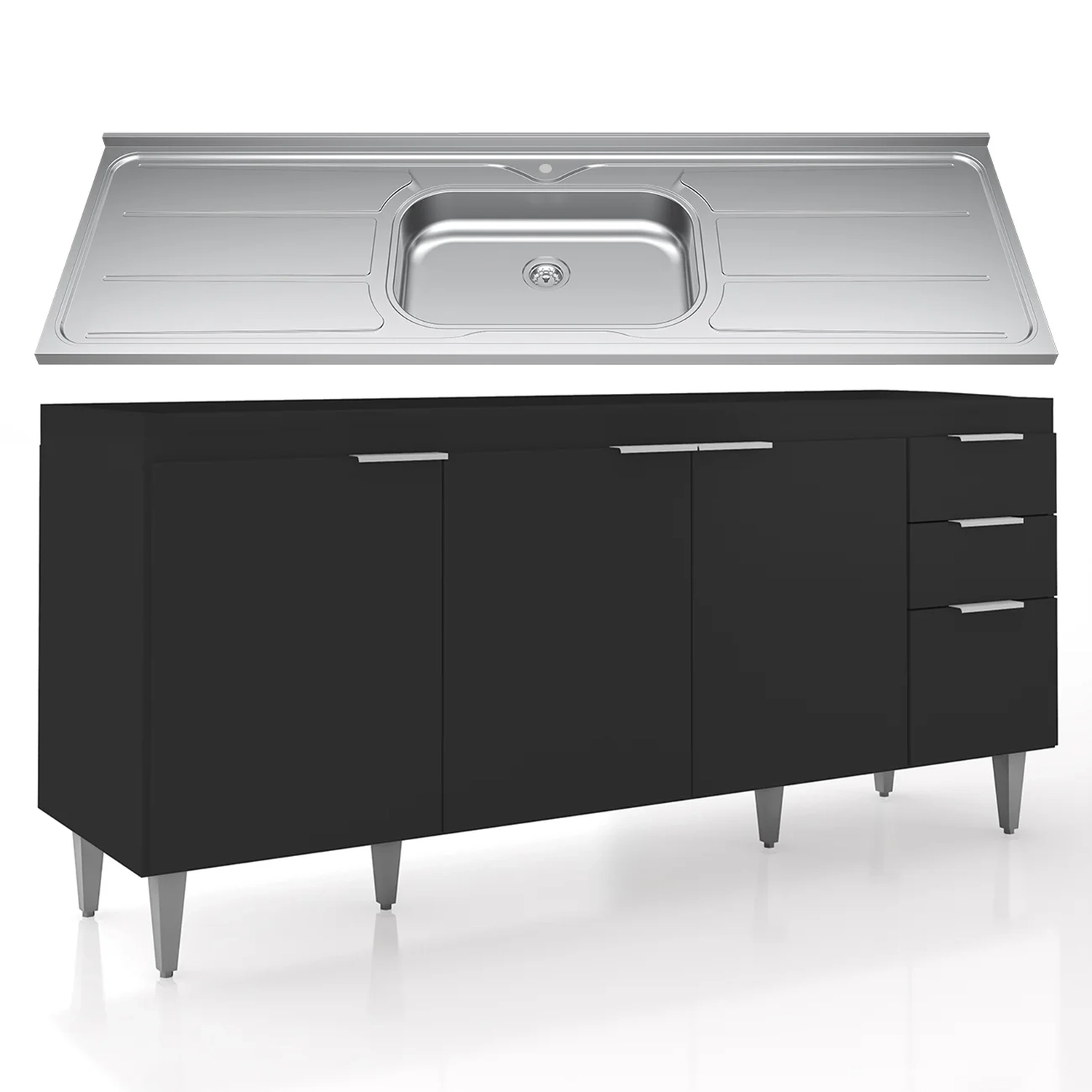 Dispõe de quatro portas com dobradiças metálicas, que proporcionam uma abertura suave, além de duas gavetas com corrediças metálicas. O Balcão Gabinete também se destaca pelos puxadores em alumínio, que adicionam um toque de sofisticação e elegância ao ambiente. Sua estrutura em MDP 15mm, com acabamento em BP, garante maior resistência e durabilidade. O Balcão de Cozinha possui uma prateleira interna que é uma excelente solução para organizar seus itens de maneira eficiente, acomodando mantimentos, panelas e outros utensílios. A Pia Inox conta com um design ideal, que tem excelente desempenho no escoamento da água e possibilita o uso de diferentes objetos sobre ela. Os pés em PVC, são reguláveis, permitindo ajustar pequenos desníveis de piso e manter a estabilidade do produto.