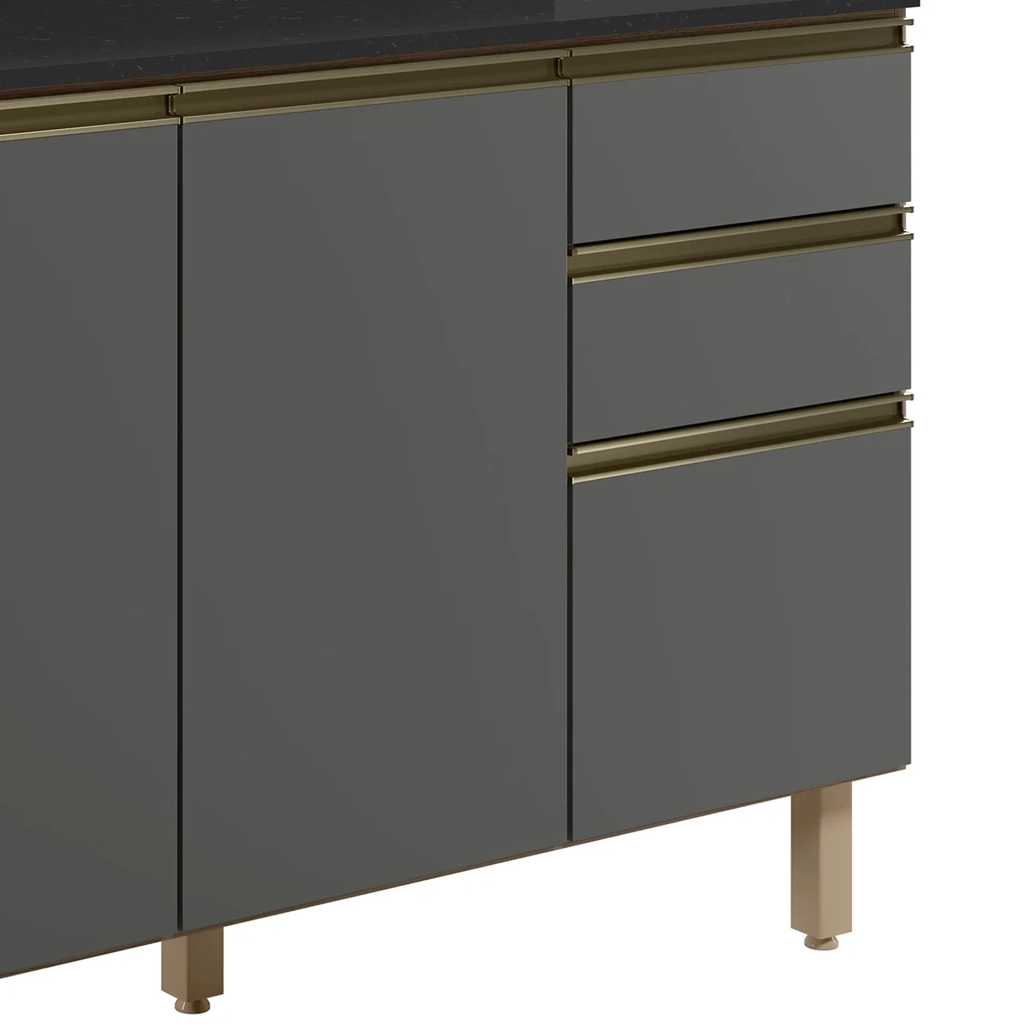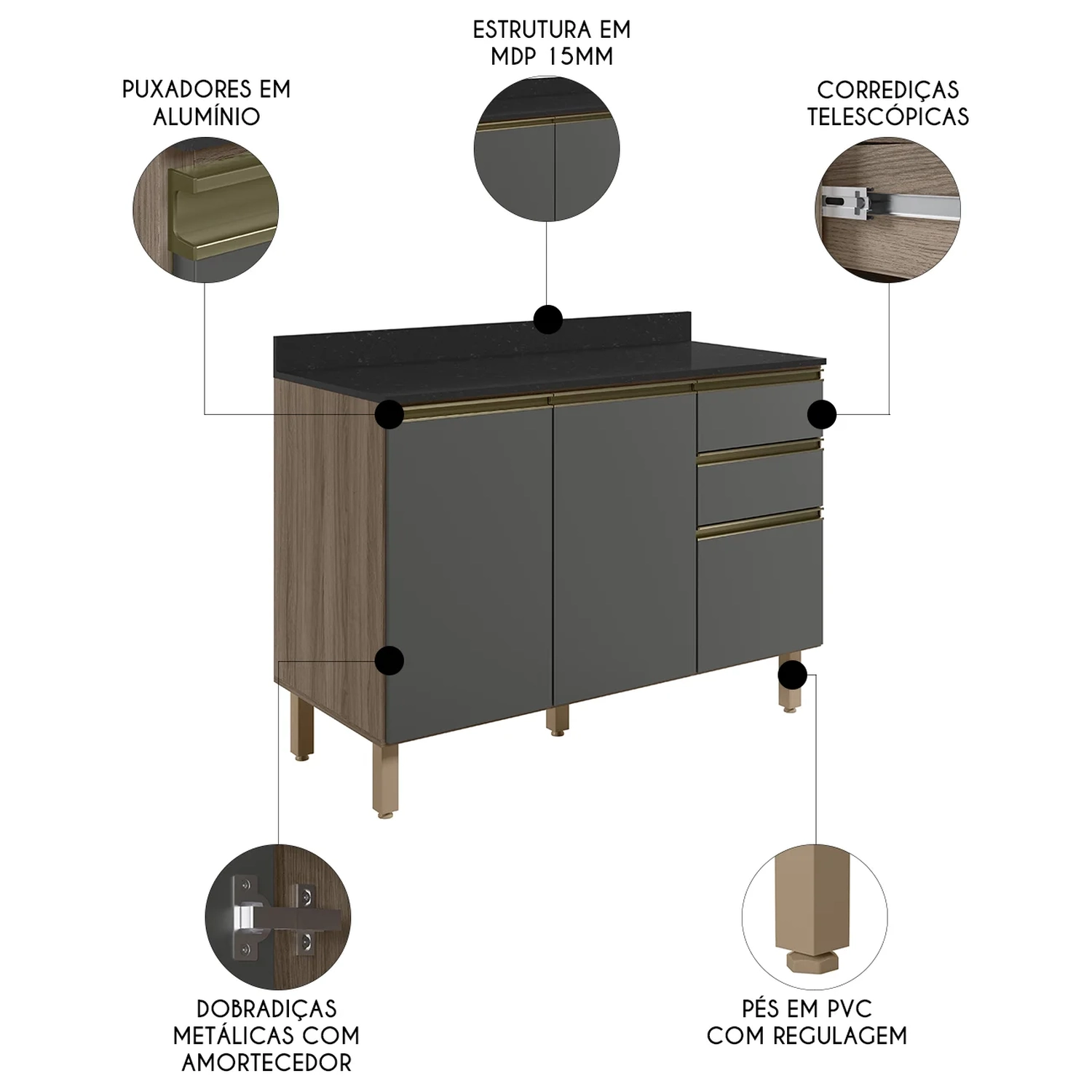 O Balcão de Cozinha oferece duas portas com dobradiças metálicas e amortecedores integrados, garantindo um fechamento suave e silencioso. Além disso, conta com três gavetas espaçosas, incluindo um gavetão, todas equipadas com corrediças metálicas telescópicas que proporcionam uma abertura e fechamento suaves. Os puxadores em alumínio adicionam um toque de sofisticação ao design do Balcão Gabinete, enquanto os pés em PVC reguláveis permitem o ajuste perfeito à altura desejada, assegurando estabilidade mesmo em pisos irregulares. O Balcão ainda possui um tampo para auxiliar no preparo das refeições ou até para apoiar seus eletrodomésticos, ideal para quem busca qualidade, durabilidade e um visual refinado na organização da Cozinha.