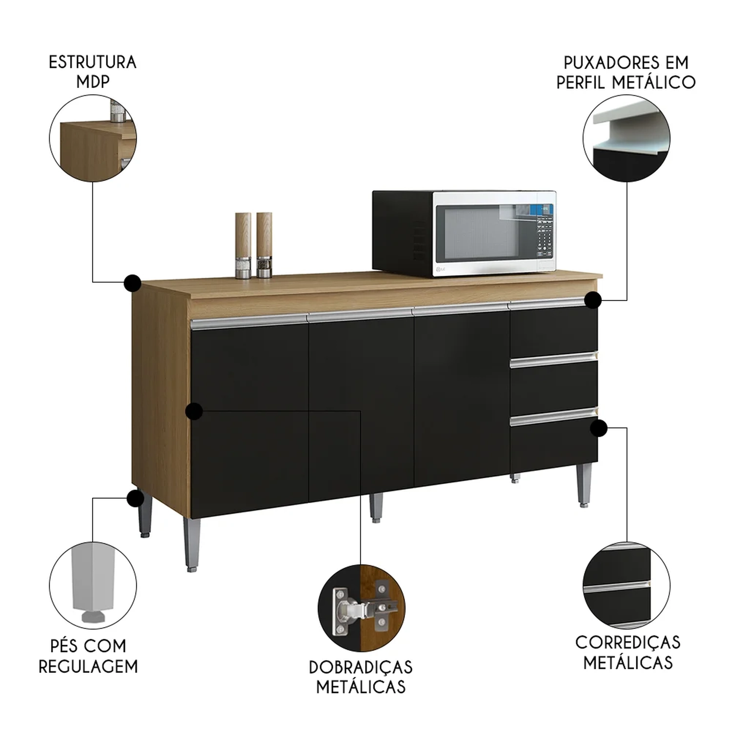 Está procurando um balcão compacto, prático e funcional para a sua cozinha? O Balcão de Cozinha Com Tampo 150cm 3 Gavetas Andréia Amêndoa/Preto, da AJL Móveis é perfeito!