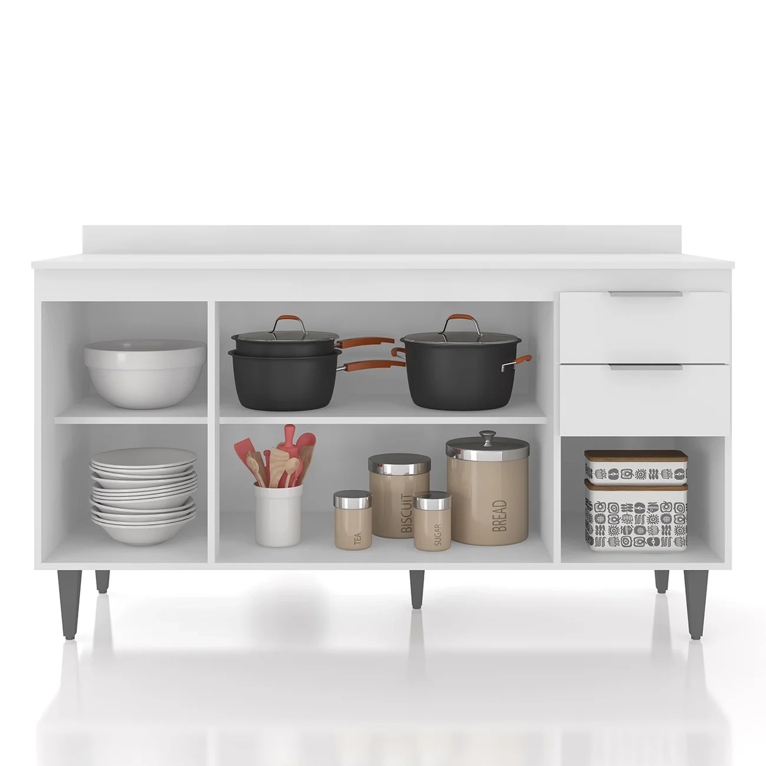 Dispõe de quatro portas com dobradiças metálicas, que proporcionam uma abertura suave, além de duas gavetas com corrediças metálicas. O Balcão Gabinete também se destaca pelos puxadores em alumínio, que adicionam um toque de sofisticação e elegância ao ambiente. Possui estrutura em MDP 15mm, com acabamento em BP, garantindo maior resistência e durabilidade. Conta com uma prateleira interna, que é uma ótima solução para organizar seus itens de maneira eficiente, acomodando mantimentos, panelas e outros utensílios. O tampo serve como apoio para eletrodomésticos ou no preparo dos alimentos, e o rodatampo que é um excelente acabamento entre o Balcão de Cozinha e a parede. Os pés em PVC, são reguláveis, permitindo ajustar pequenos desníveis de piso e manter a estabilidade do produto.