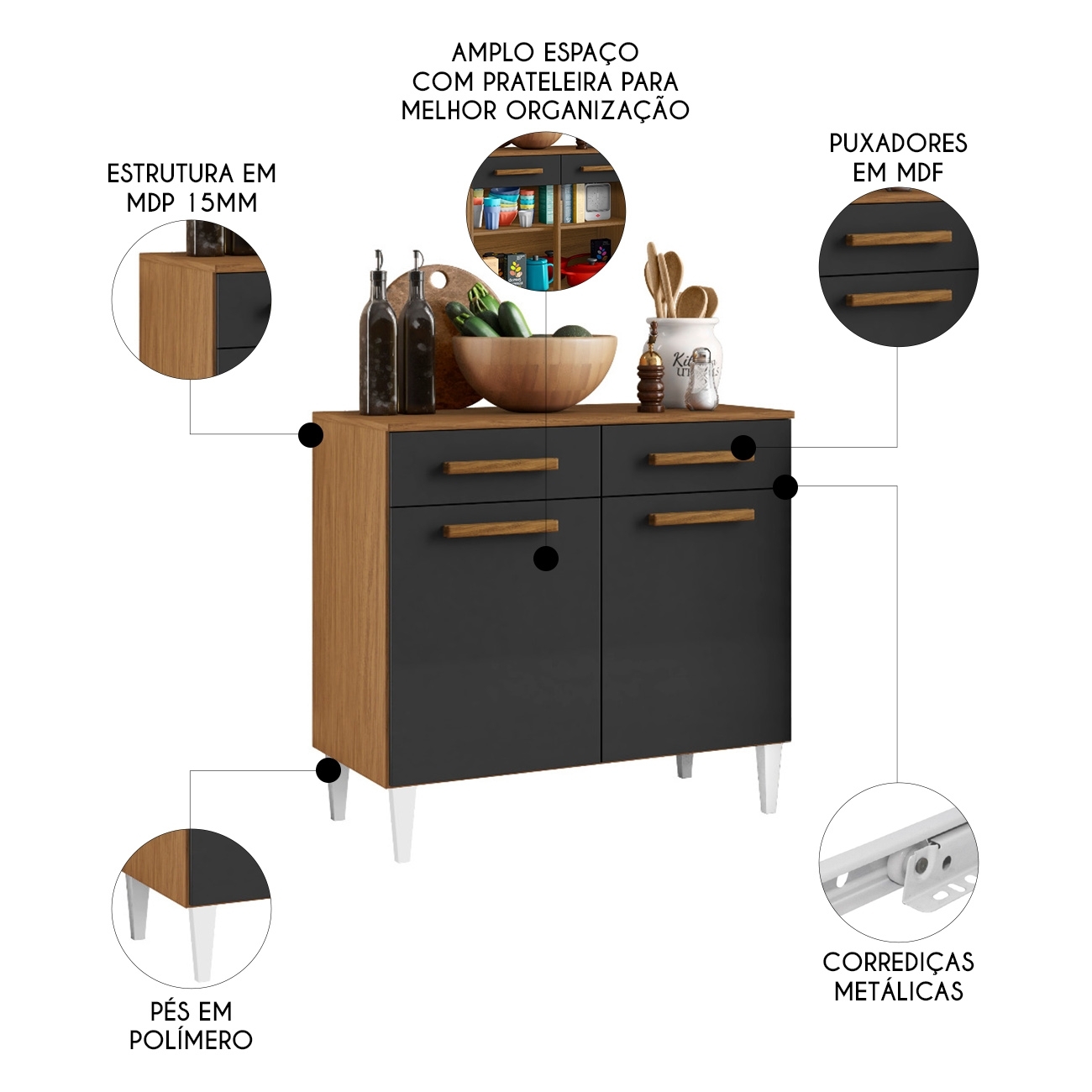 Sua estrutura em MDP garante resistência e durabilidade, enquanto os puxadores em MDF agregam um toque sofisticado. As dobradiças e corrediças metálicas proporcionam funcionamento suave e seguro.