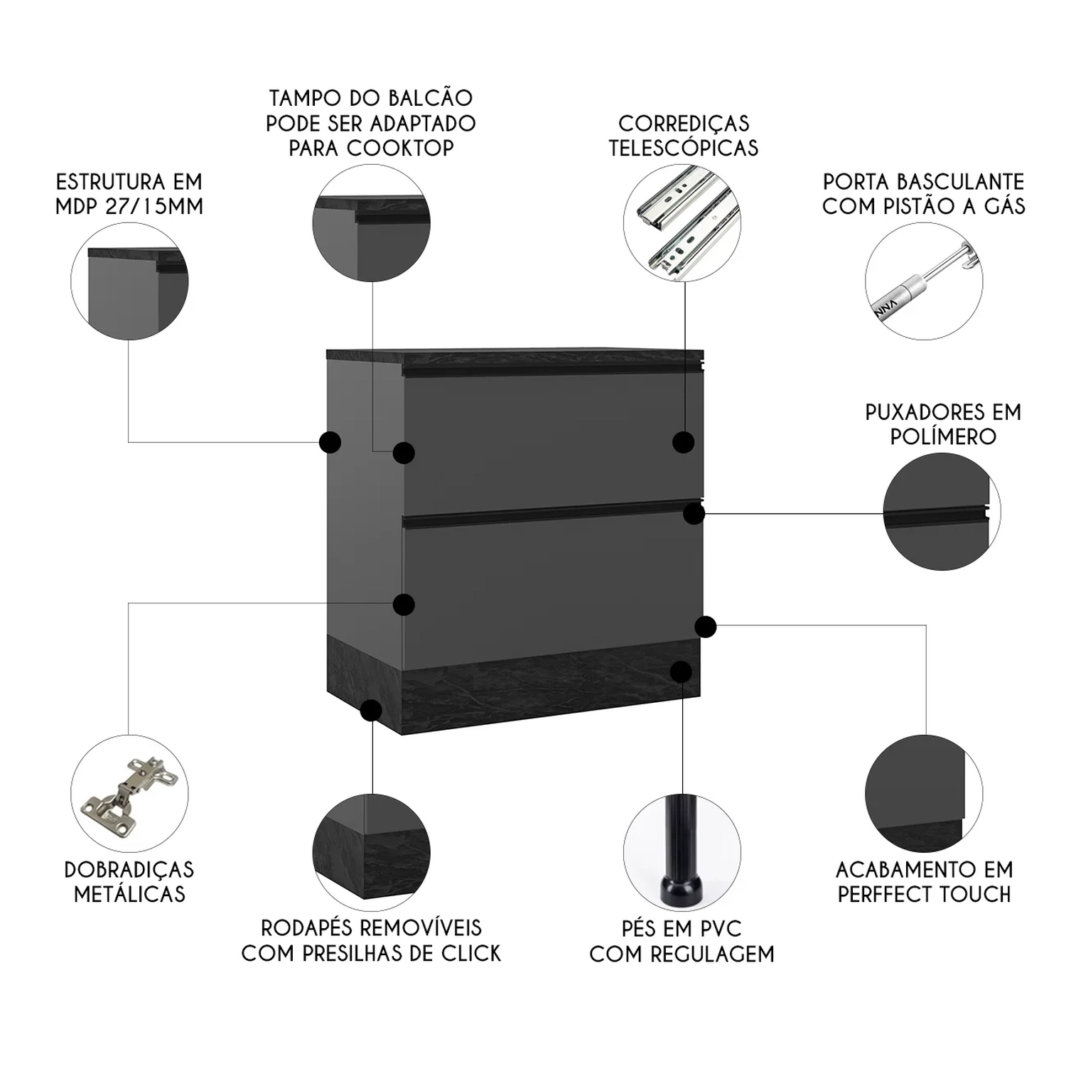 Conta com uma porta basculante com pistão a gás e dobradiças metálicas, que proporcionam um movimento suave e controlado. Além disso, possui gaveta com corrediças telescópicas, proporcionando abertura total e fácil acesso aos utensílios. Os puxadores perfil em polímero acrescentam um toque de sofisticação, harmonizando com diversos estilos de decoração.